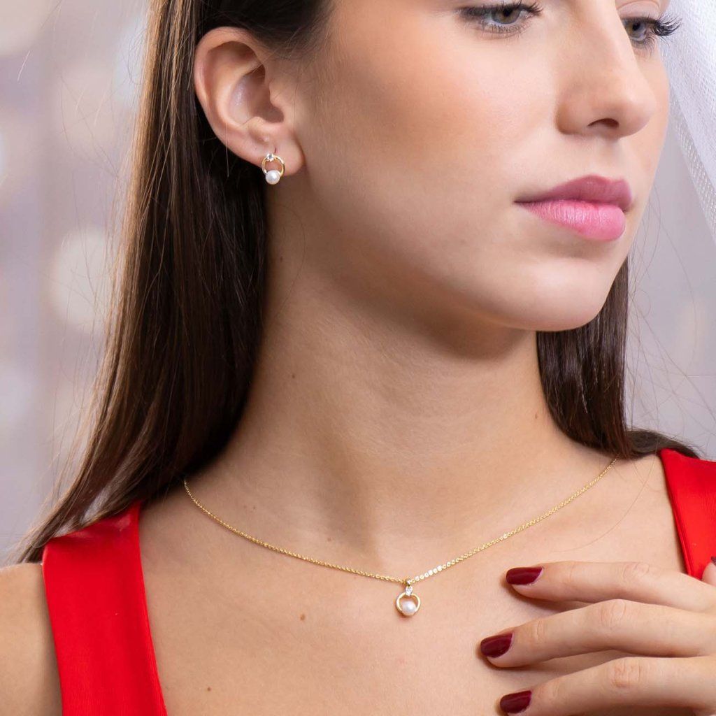 Súprava pozlátená 14k - retiazka s príveskom a náušnice v dizajne kruhu osadenom zirkónom a perlou.