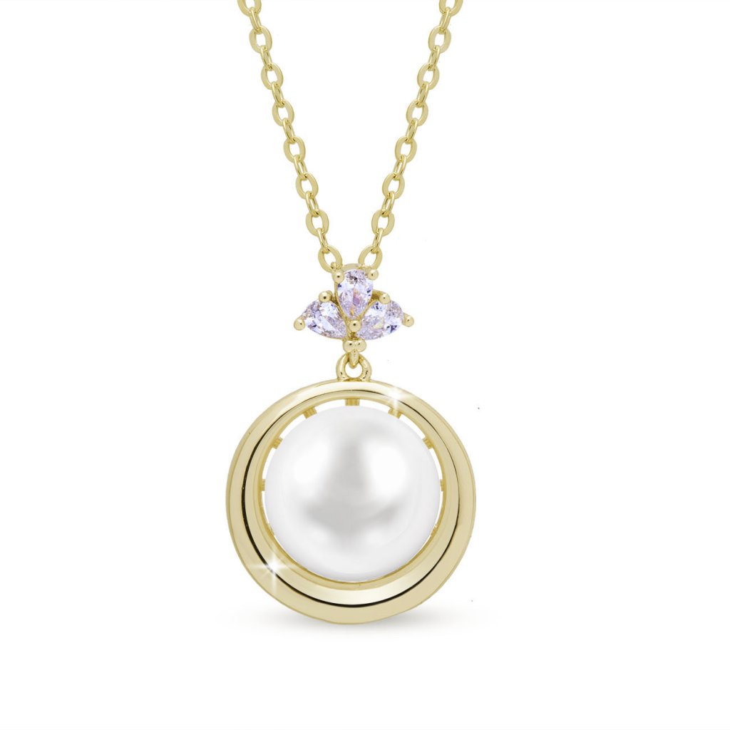 Pozlátená dámska retiazka s perlou a ozdobným zirkónom v tvare lístka.
