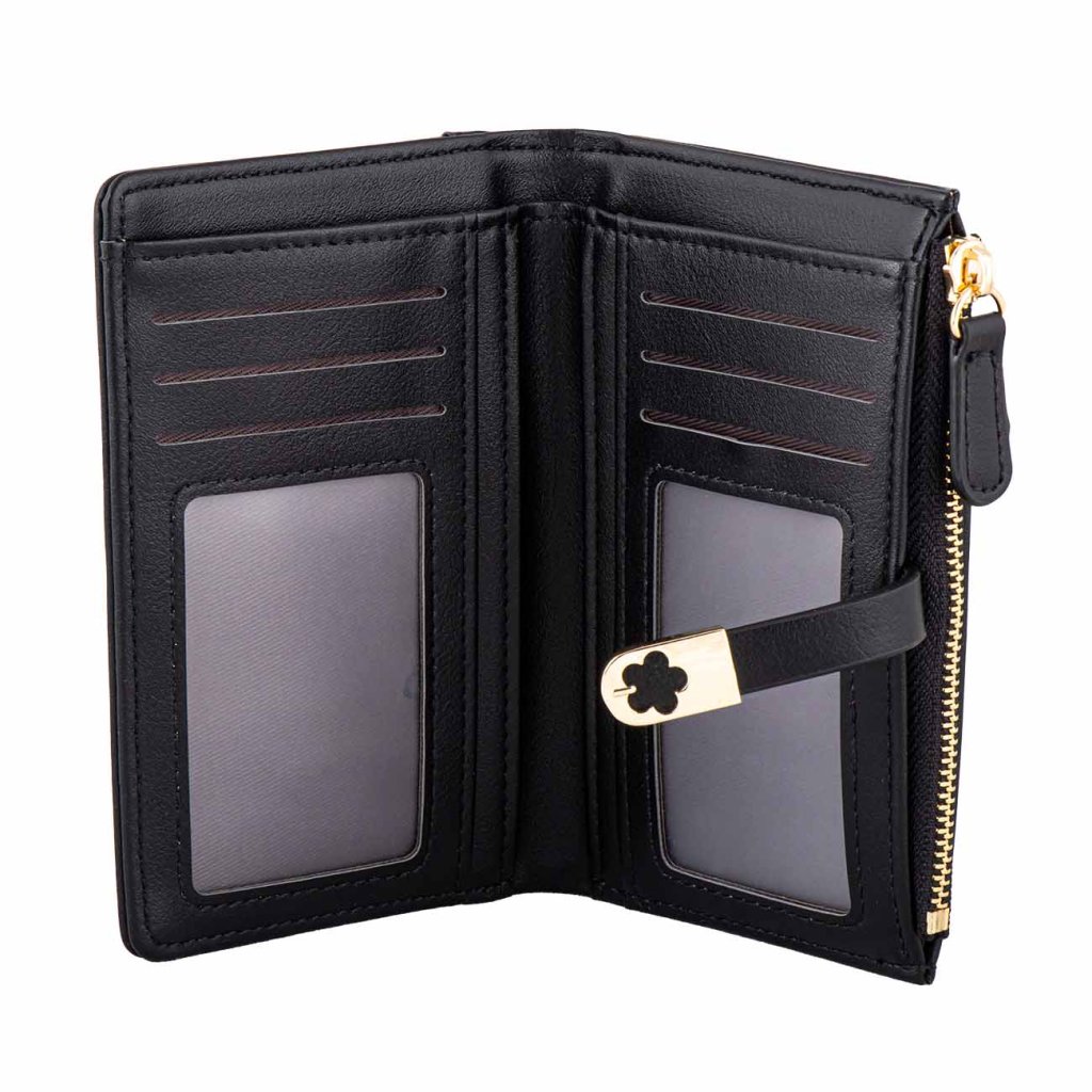Kompaktná, no dokonale praktická peňaženka, ktorá kombinuje jemne štruktúrovaný povrch, zlaté detaily a premyslené vnútorné členenie. Moderný dizajn ozvláštňuje kovová spona s motívom kvetiny, vďaka ktorej pôsobí peňaženka štýlovo a nadčasovo.