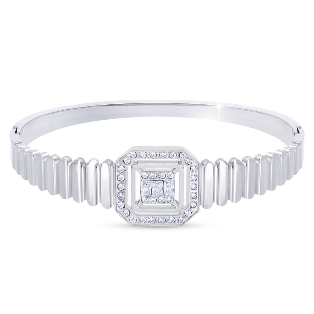 Výrazný náramok v lesklom striebornom prevedení zaujme hranatým stredom zdobeným čírymi kamienkami. Jemne rebrovaný dizajn dodáva šperku moderný štýl a pevné prevedenie s pružinovým zapínaním zaistí pohodlné nosenie. Ideálny doplnok na každú príležitosť.