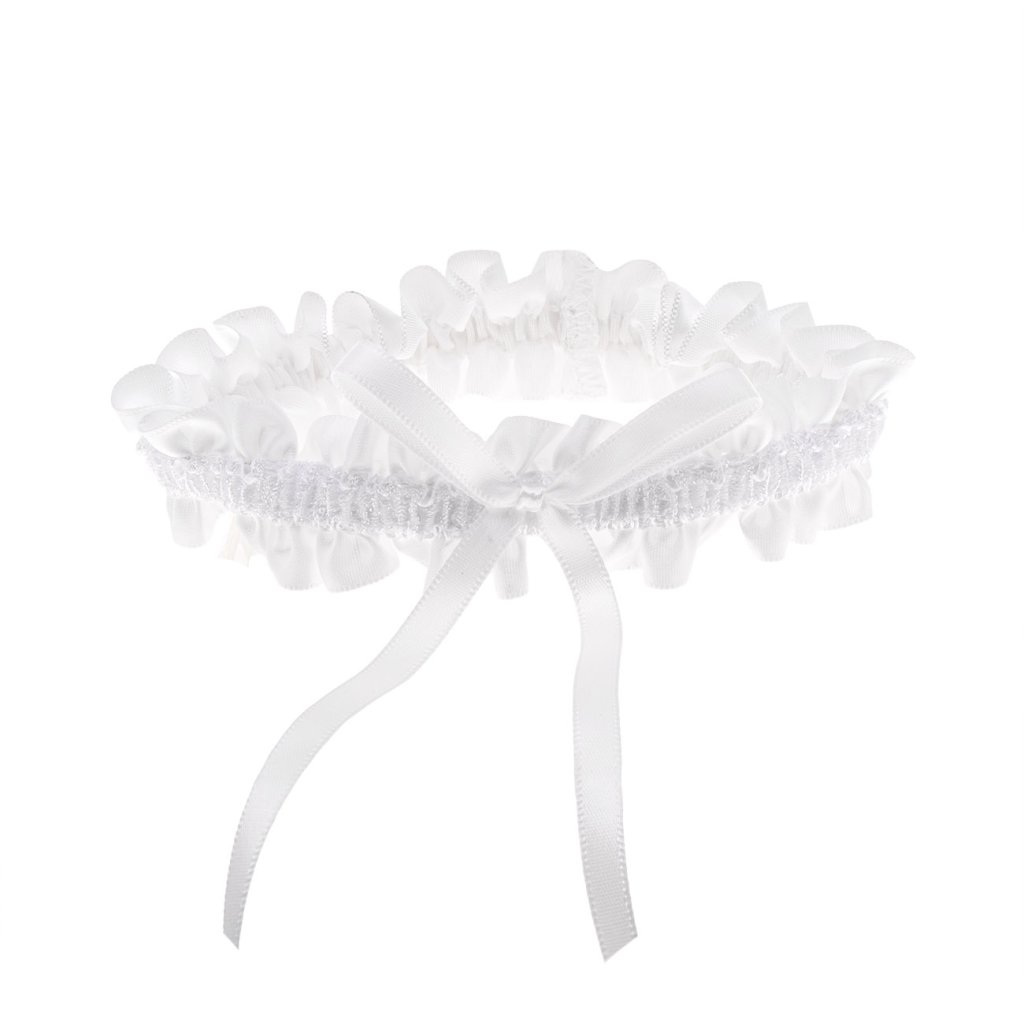 Nežný biely svadobný podväzok s romantickým dizajnom doplní váš svadobný outfit o tradičný detail s jemnou dávkou elegancie. Podväzok je vyrobený z pružného materiálu, vďaka ktorému pohodlne sedí na nohe. Stred zdobí saténová mašlička, lem je zakončený volánikmi pre dokonalý dievčenský vzhľad. Hodí sa pre klasickú aj modernú nevestu.