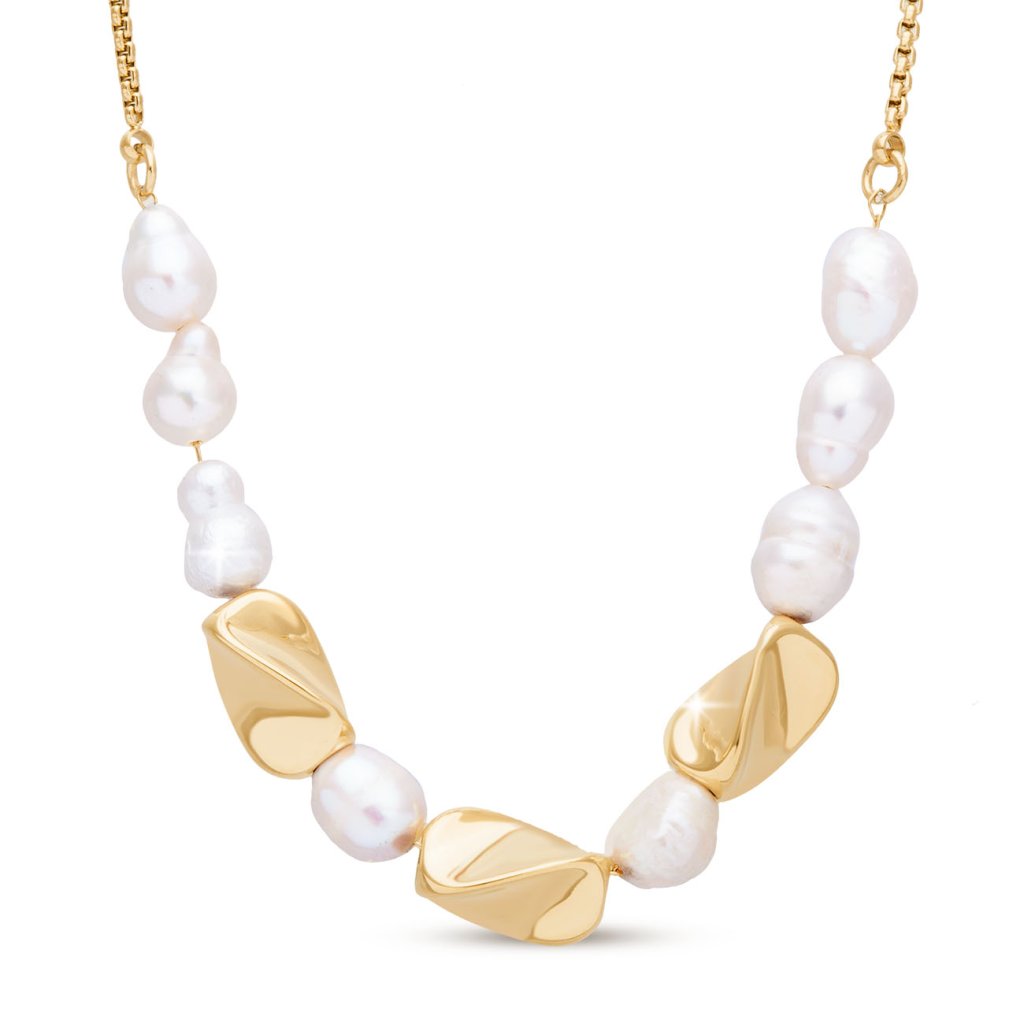 Jemná 14k pozlátená retiazka z chirurgickej ocele. Pletená retiazka je zdobená korálkami nepravidelného tvaru a pozlátenými 14k točenými korálkami.
