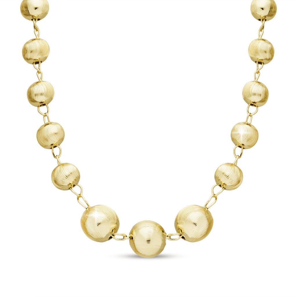 Táto výrazná retiazka zaujme svojím elegantným dizajnom, kde dominujú guľaté perlové koráliky s jemným rebrovaním. Je ideálna pre ženy, ktoré hľadajú originálny a zároveň sofistikovaný doplnok. Lesklý povrch a pravidelne rozmiestnené koráliky dodávajú šperku nadčasový charakter.