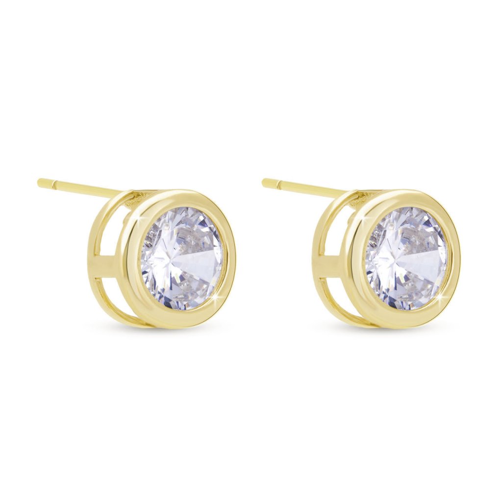 Elegantné náušnice s výrazným okrúhlym zirkónom v hladkom rámčeku pôsobia luxusne a nadčasovo. Lesklý povrch s pozlátenou úpravou krásne ladí s iskrivým kameňom, vďaka čomu sú náušnice skvelou voľbou pre slávnostné príležitosti aj každodenné nosenie. Minimalistický dizajn zvýrazní krásu tváre bez zbytočnej okázalosti.