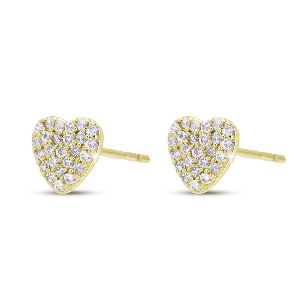 Krásne jemné náušnice pozlátené 14 karátovým zlatom. Decentné srdiečka - lupienky, zdobené čírymi drobnými zirkónmi.