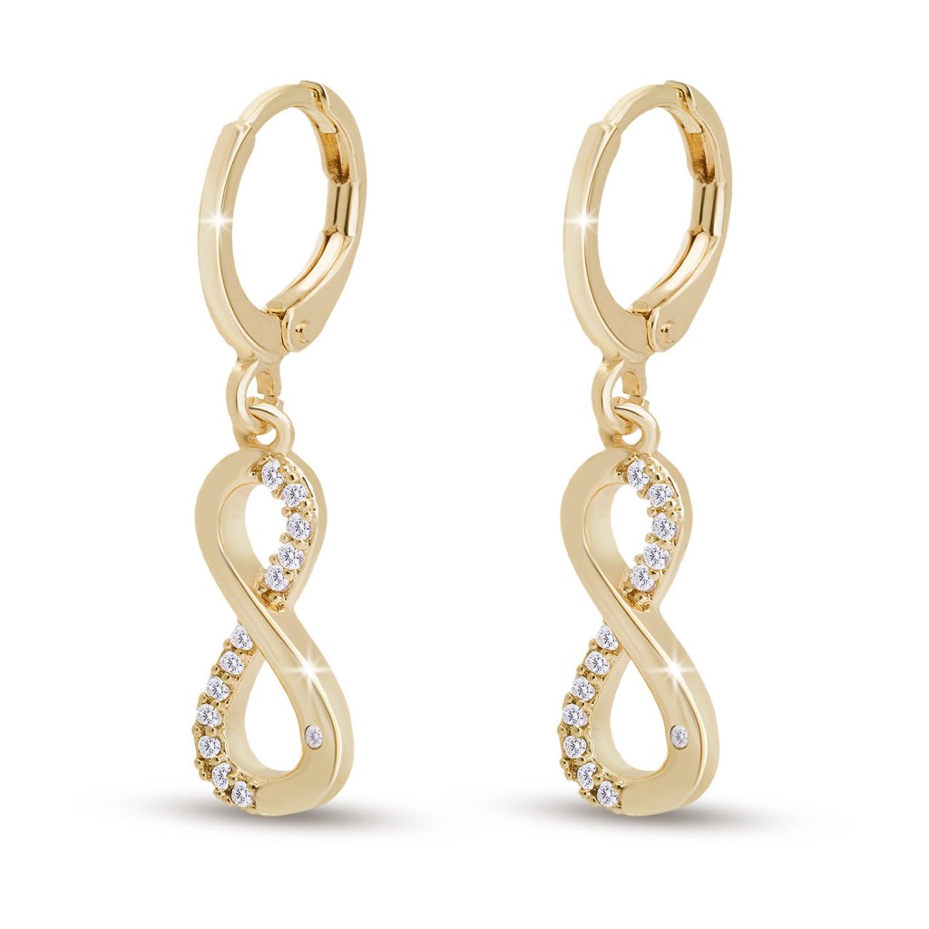 14k pozlátené visiace náušnice. Náušnice tvorí znak nekonečna zdobený drobnými čírymi zirkónmi. Znak je zavesený na malom krúžku s očkom.