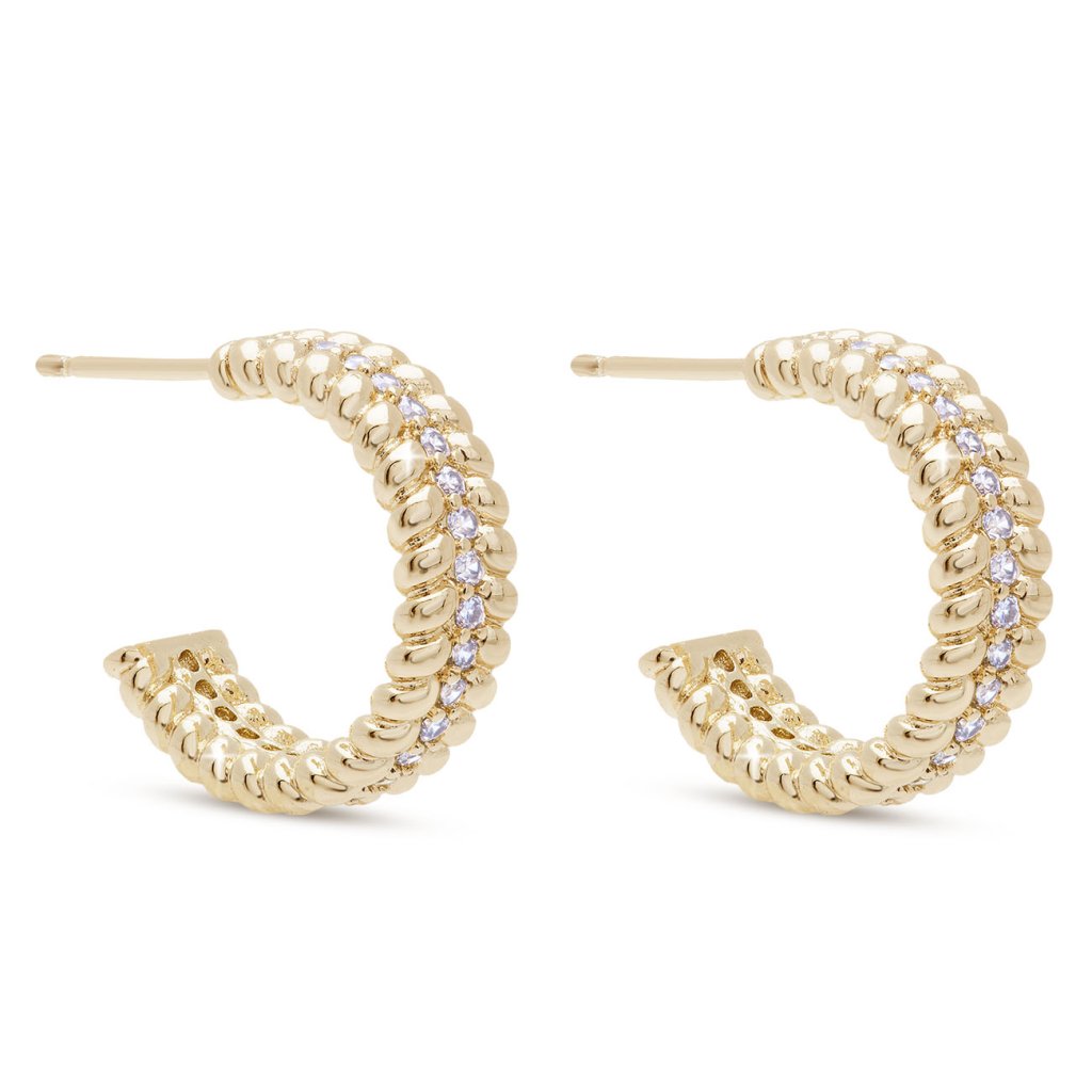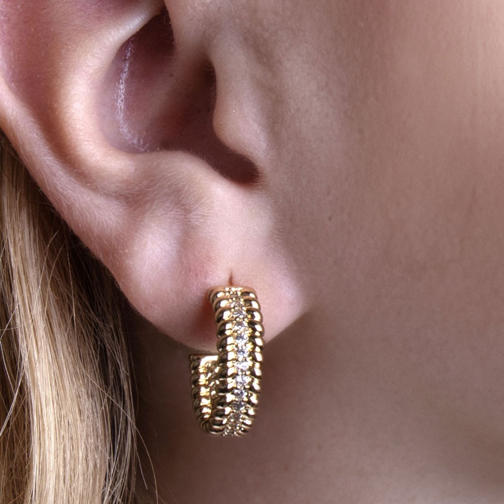 Pozlátené náušnice 14k kruhy, posiate radom zirkónov. Okraje sú zdobené pleteným motívom