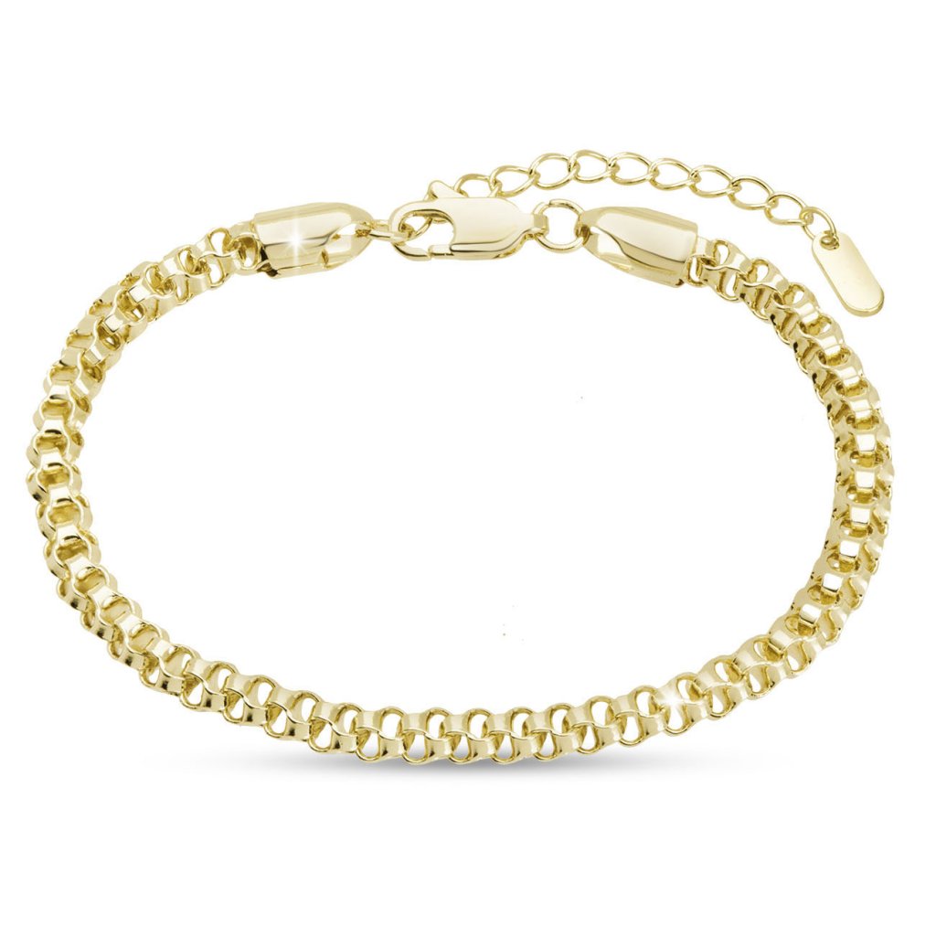 Tento nadčasový náramok vyniká pravidelnou štruktúrou drobných, hladko brúsených očiek. Vďaka jemnému lesku pozlátenia pôsobí decentne, ale zároveň sofistikovane. Praktické predĺženie s karabínkou zaisťuje pohodlné prispôsobenie dĺžky zápästia.