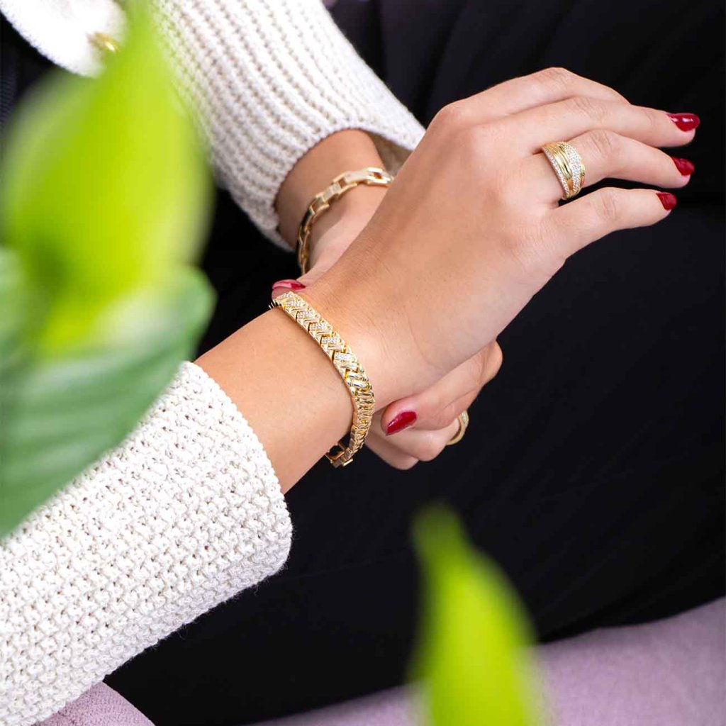 Elegantný náramok s výraznými článkami v zlatom prevedení ozdobený trblietavými zirkónmi je skvelou voľbou na každodenné aj slávnostné nosenie. Moderný geometrický vzor vynikne samostatne aj v kombinácii s ďalšími doplnkami. Štýlový šperk, ktorý podčiarkne váš jedinečný vkus.