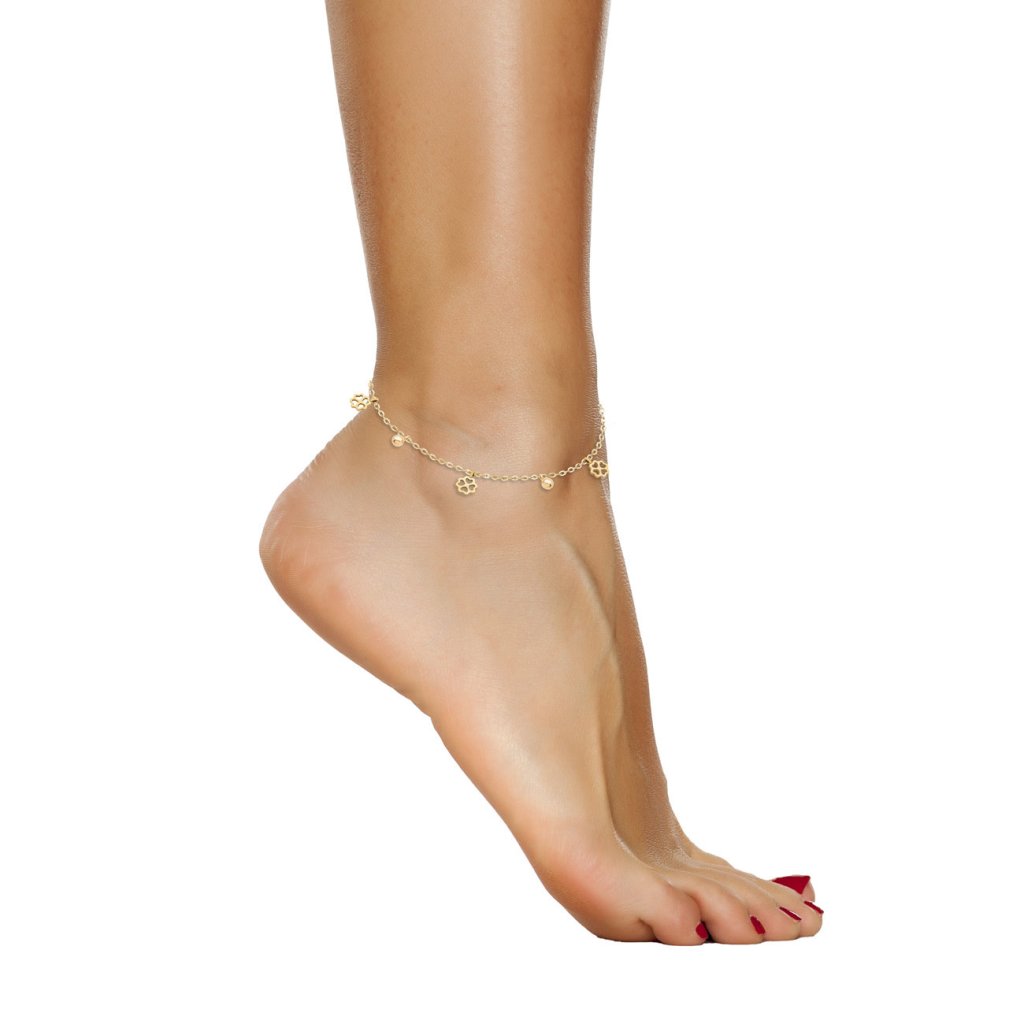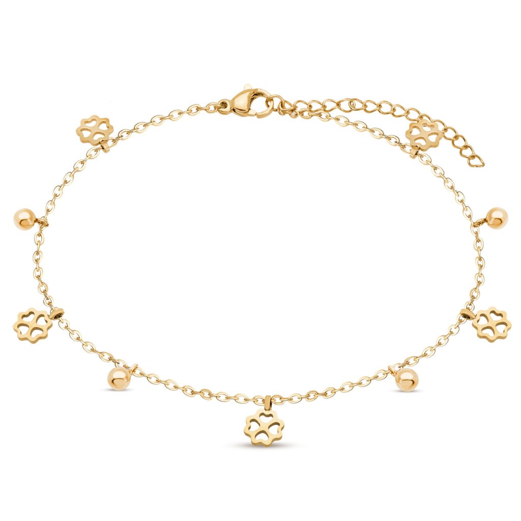 Vyjadrite sa touto jemnou retiazkou na nohu z chirurgickej ocele s motívom drobných guličiek a štvorlístkov. Táto retiazka na nohu je vyrobená z jemnej chirurgickej ocele pre maximálne pohodlie a je tiež antialergická! Vďaka malej veľkosti je ideálna na každú príležitosť alebo k akémukoľvek oblečeniu a zapínanie na karabínku zaručuje, že sa retiazka pri chôdzi nerozviaže. Tento úžasný náramok je pokrytý 14-karátovým zlatom pre mimoriadne luxusný lesk. Či už chcete svojmu vzhľadu dodať štýl, alebo len chcete niečo, čím môžete predviesť svoj jedinečný zmysel pre módu - tento doplnok je pre vás ideálny!