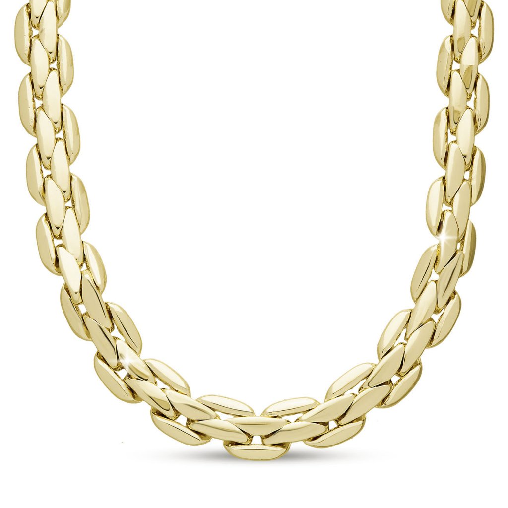 Štýlový a sebavedomý – táto masívna retiazka s plochými, hladko brúsenými článkami zaujme na prvý pohľad. Je vyrobená z kvalitného rhodiovaného kovu a pozlátená 14-karátovým zlatom, čo z nej robí ideálny doplnok pre ženy, ktoré chcú dodať svojmu outfitu šmrnc.