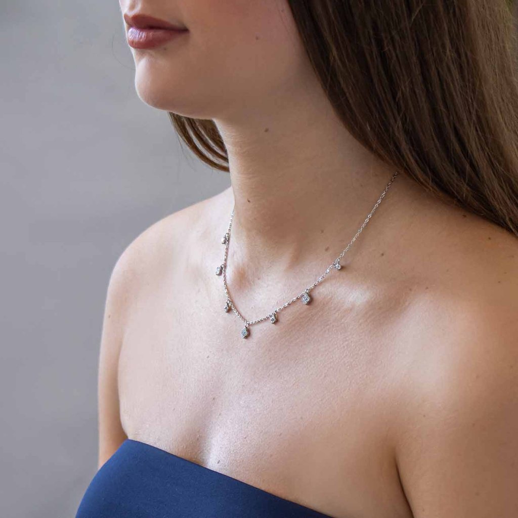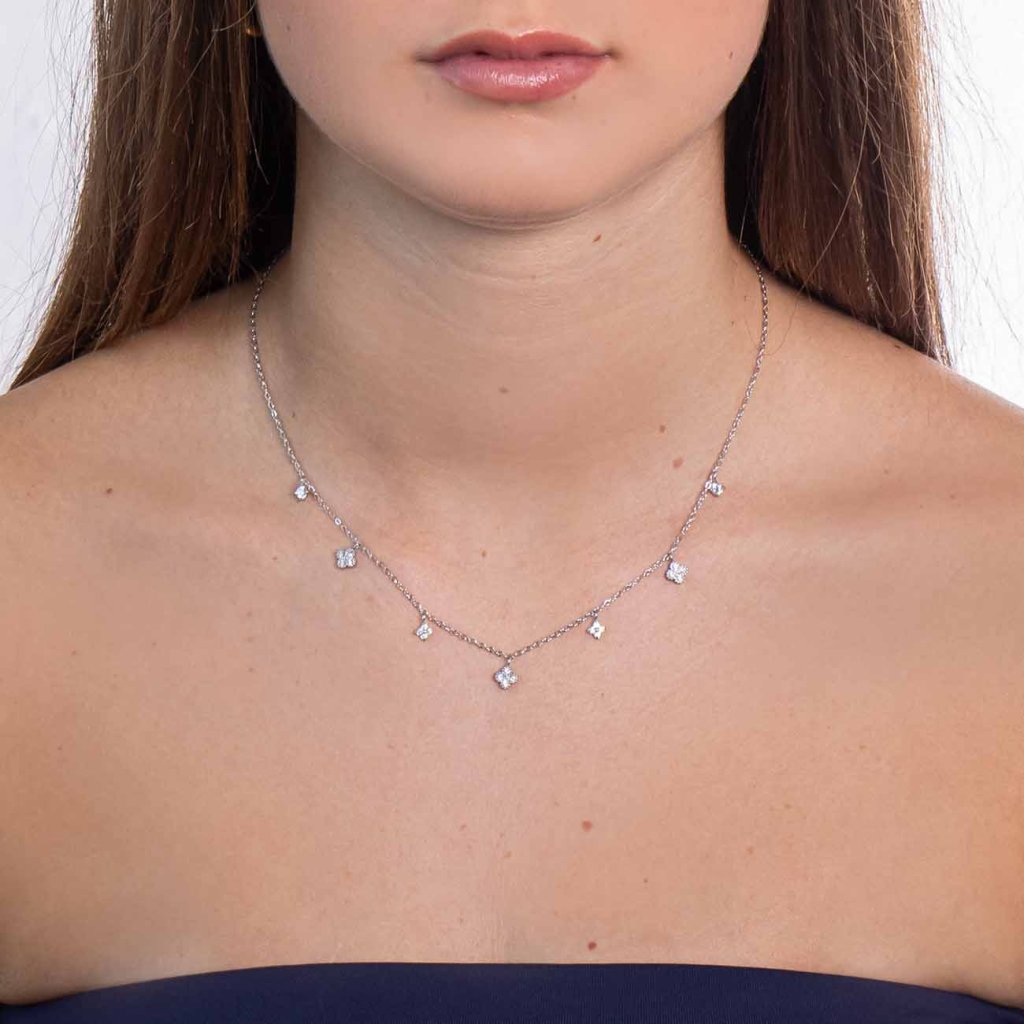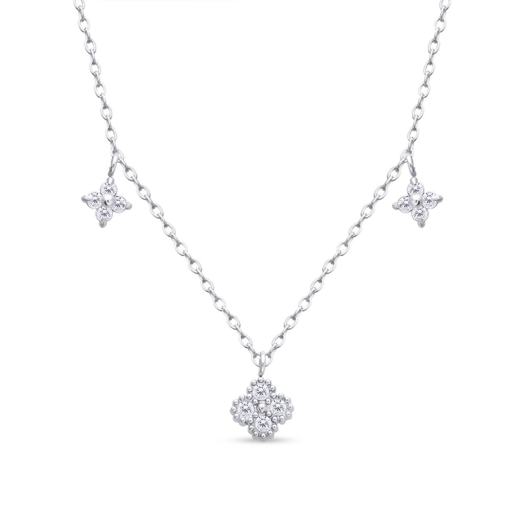 Decentná retiazka z chirurgickej ocele s jemnými kvetinovými príveskami rôznych veľkostí doplnené bielymi zirkónmi.