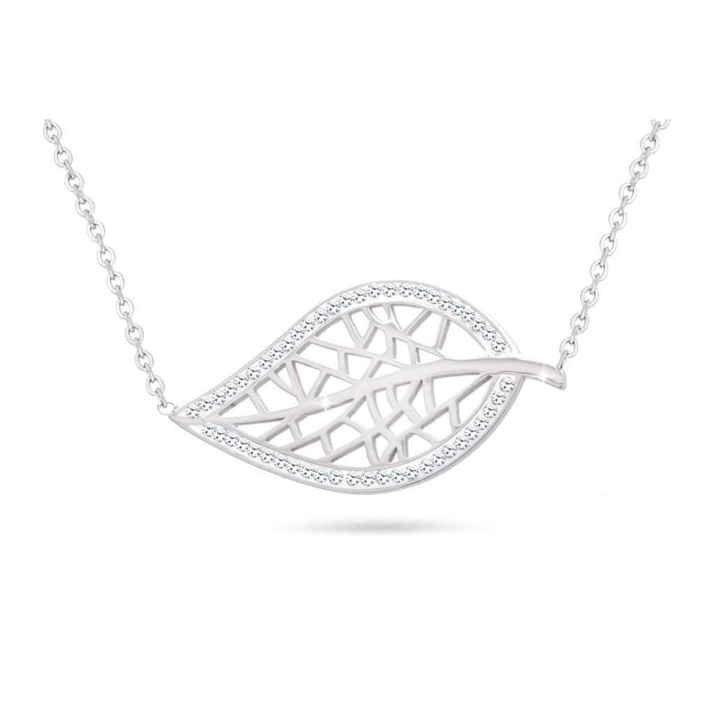 Decentná a jemná retiazka z chirurgickej ocele s príveskom, ležiaci lístok s bielym podfarbením a zirkónmi.
