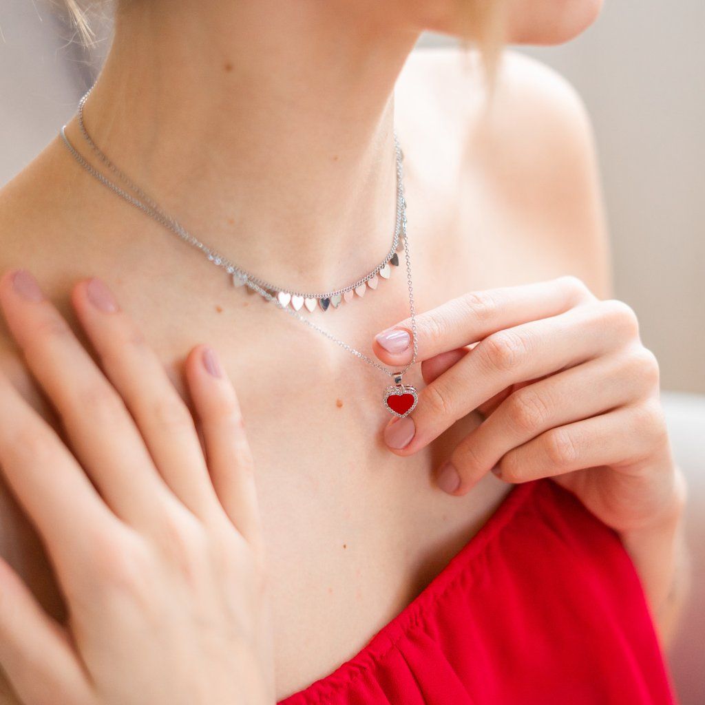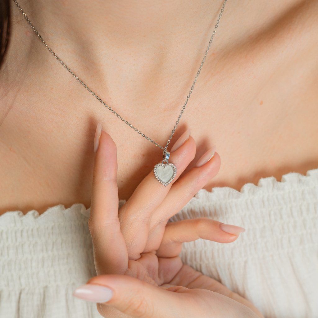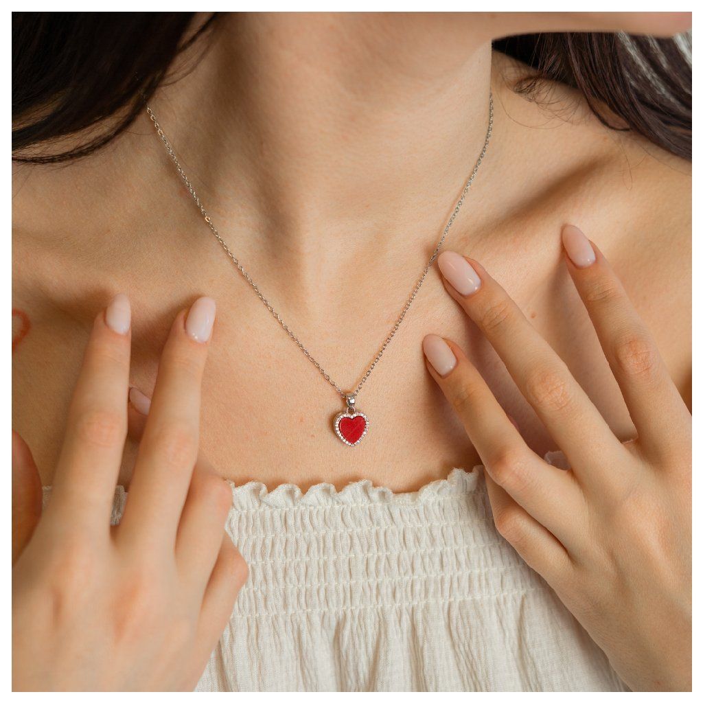 - Decentná a jemná retiazka z chirurgickej ocele s príveskom, srdce s červeným a bielym perleťovým kamienkom.