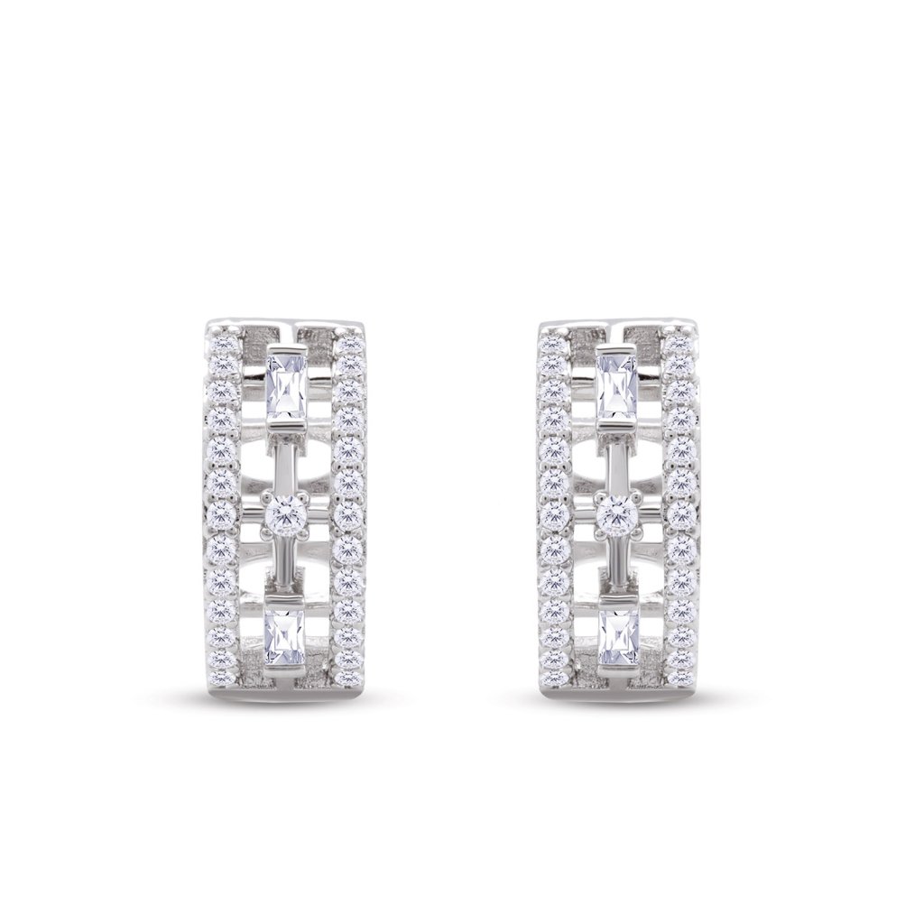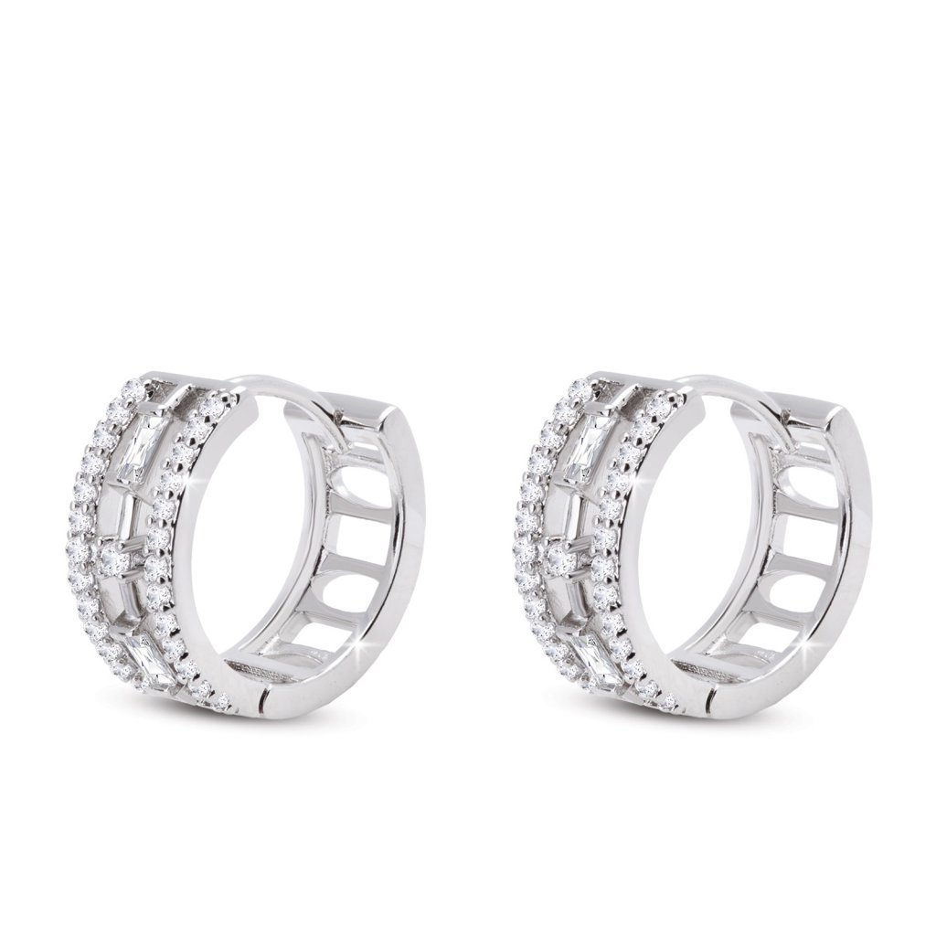 - Ródiované náušnice, lesklé visiace krúžky s čírymi zirkónmi.