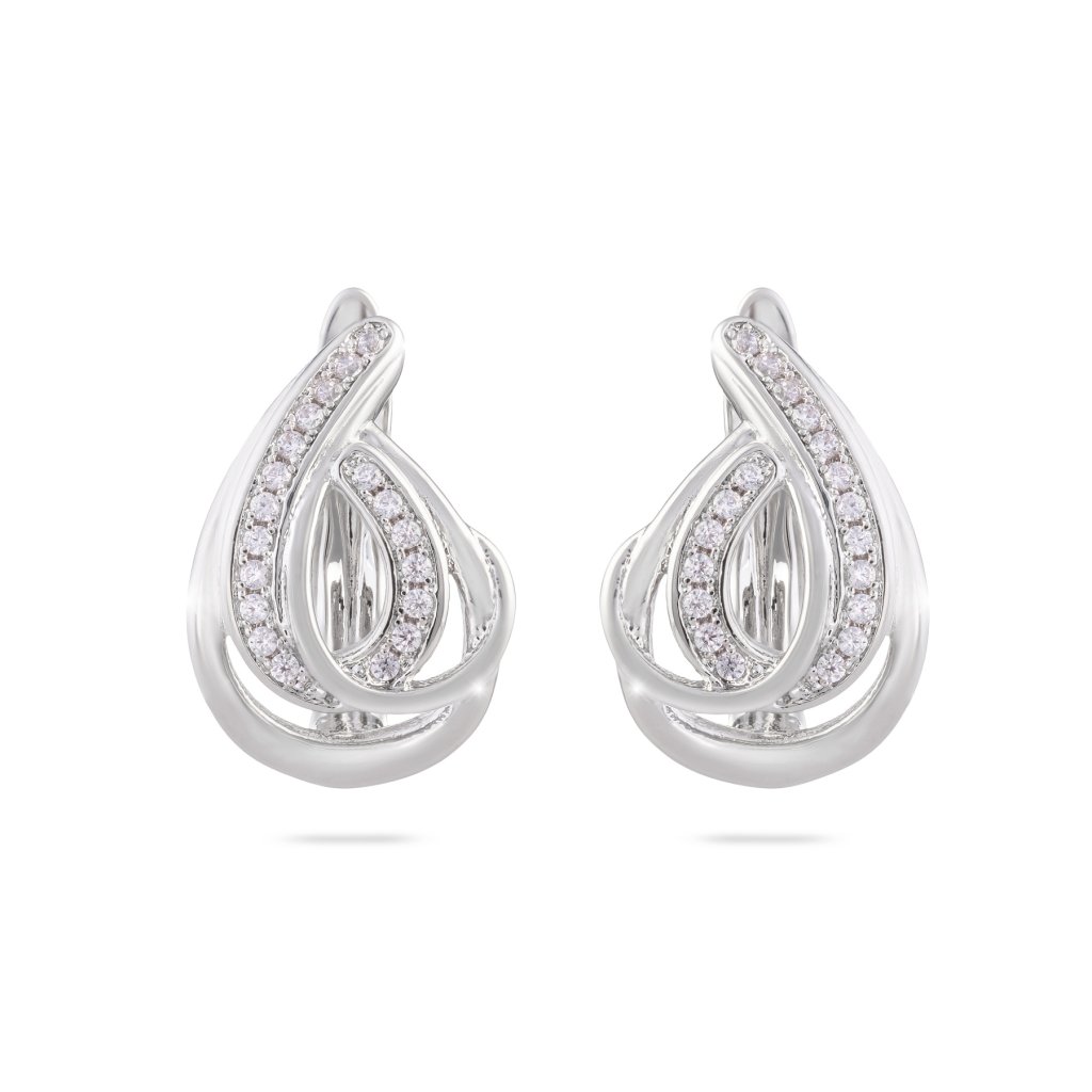 - Rhodiované náušnice visiace, skrútená kvapka s pásmi zirkónov.