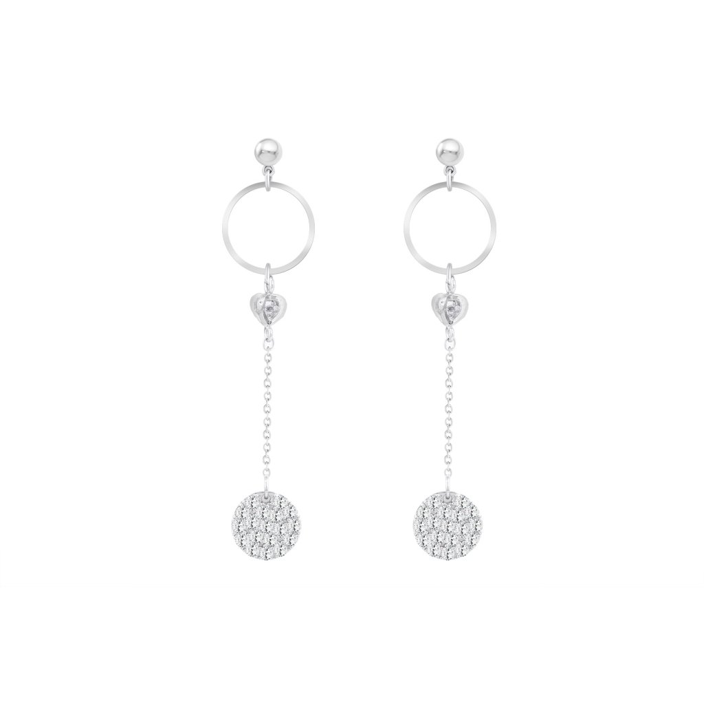 Náušnice visiaci kruh s dlhou retiazkou a kolieskom so zirkónmi, ktoré vynikajú jednoduchou eleganciou. Alebo ako sa hovorí, v jednoduchosti je krása.