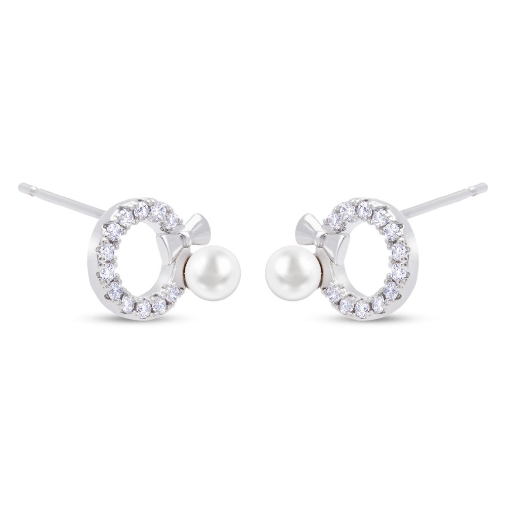 Romantické a nežné náušnice, ktoré si zamilujete na prvý pohľad. Kruhový tvar osadený trblietavými zirkónmi dopĺňa decentná perla a drobná mašlička, ktorá dodáva šperku dievčenský šarm. Vďaka rhodiovanému povrchu si náušnice uchovávajú dlhodobý lesk a odolnosť proti sčernaniu.