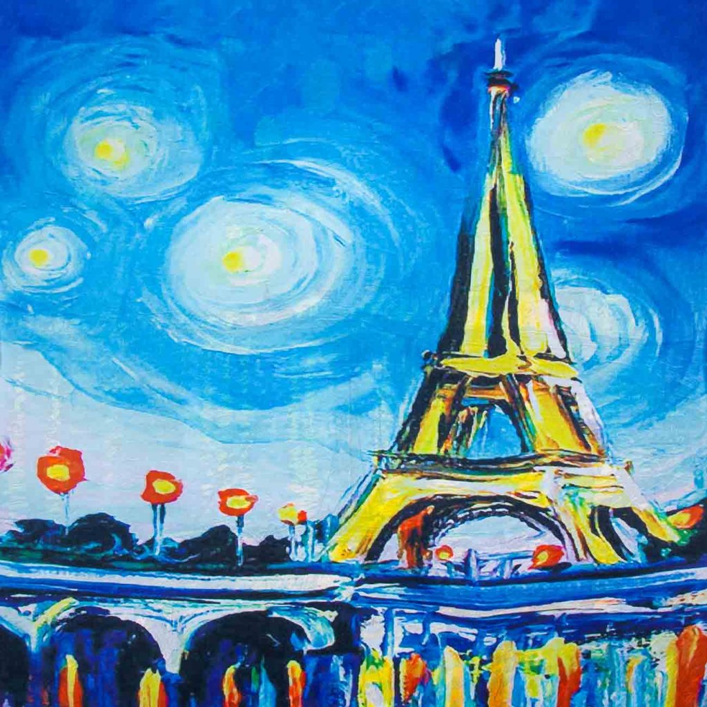 Dámska obojstranná šatka letuška RR30553 s potlačou maľby - Nočné mesto a Eiffelova veža