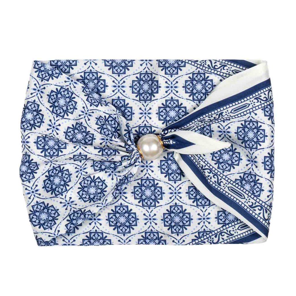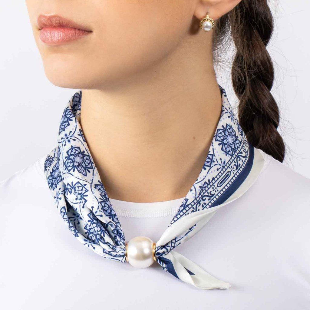 Táto jemná hodvábna šatka Vás očarí precíznym vzorom v modro-bielych tónoch, ktorý pôsobí nadčasovo a zároveň sviežo. Žiarivý dizajn doplnený magnetickou sponou s perlou vytvára výrazný, ale stále elegantný doplnok pre každú príležitosť. Ideálna voľba, keď chcete podčiarknuť svoj štýl s ľahkosťou a vkusom.