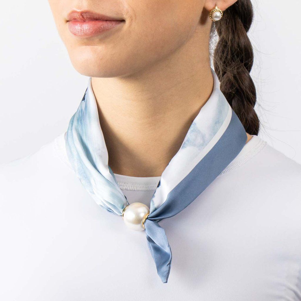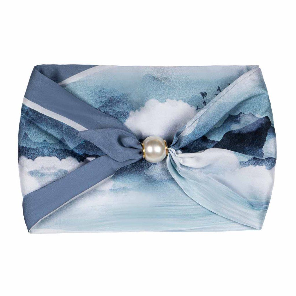 Žiarivá hodvábna šatka inšpirovaná akvarelovou krajinou pôsobí mimoriadne jemne a harmonicky. Plynulé prechody modrých odtieňov vytvárajú upokojujúci a nadčasový efekt, ktorý podčiarkne Vašu prirodzenú eleganciu. Perlová magnetická spona dodáva celku precízny detail a zaisťuje pohodlné nosenie.