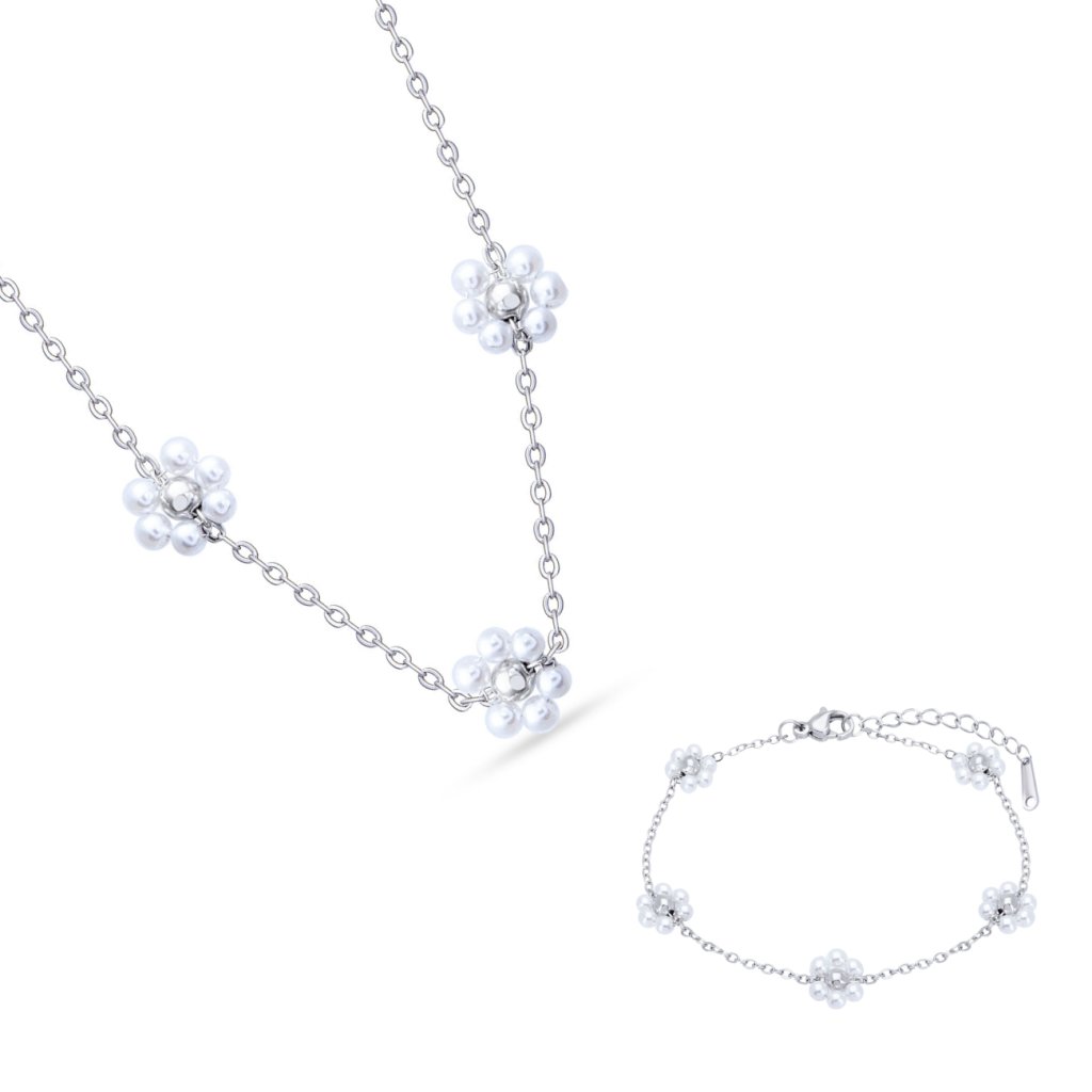 Nežná súprava pozostávajúca z retiazky a náramku zdobených drobnými kvietkami z perličiek pôsobí jemne, romanticky a zároveň moderne. Lesklý povrch chirurgickej ocele krásne kontrastuje s bielym perlovým zdobením, vďaka čomu šperky pôsobia elegantne a decentne. Ideálny doplnok pre ženy, ktoré milujú nadčasový štýl a detailné spracovanie.