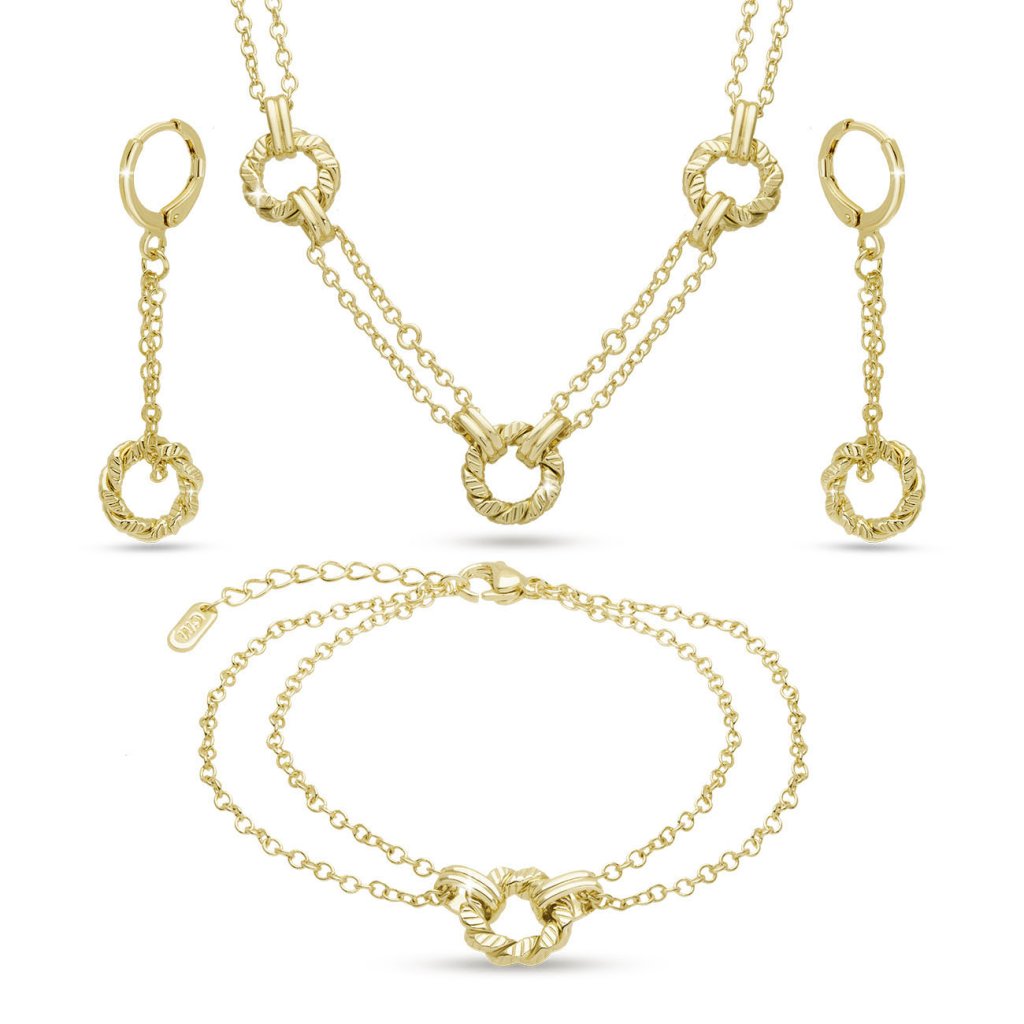 Elegantný pozlátený set s jemným kruhovým motívom zaujme svojou čistou líniou a moderným prevedením.