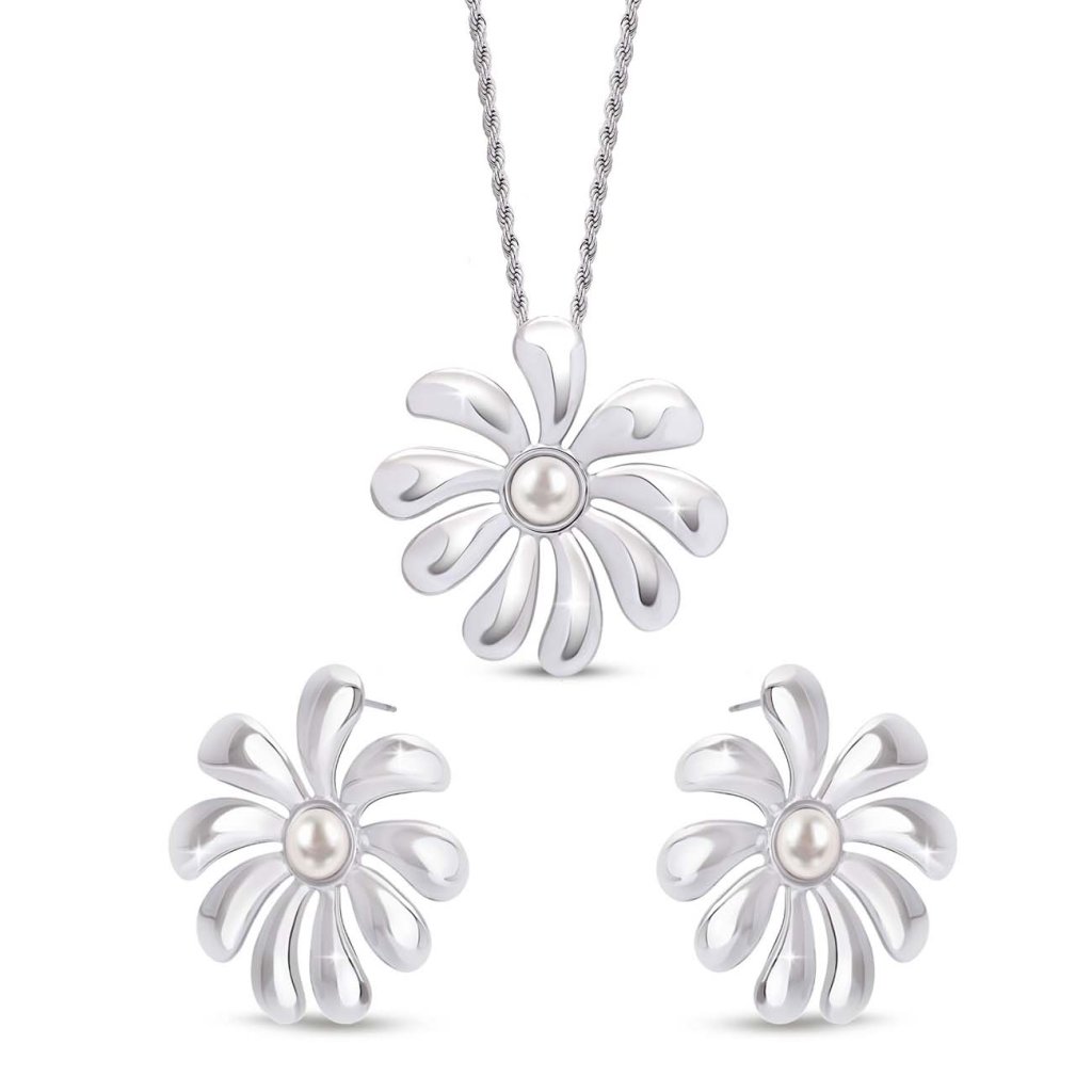 - Súprava je vyrobená z chirurgickej ocele za bezkonkurenčnú cenu a pozostáva z masívnej pletenej retiazky s príveskom kvetov osadeným perlou a náušníc v rovnakom štýle. Táto súprava je skvelou voľbou nielen na slávnostnejšie príležitosti, ale aj na doplnenie jednoduchých šiat alebo obľúbeného topu. Vďaka prepracovanosti tejto súpravy pôsobí veľmi elegantne a originálne.