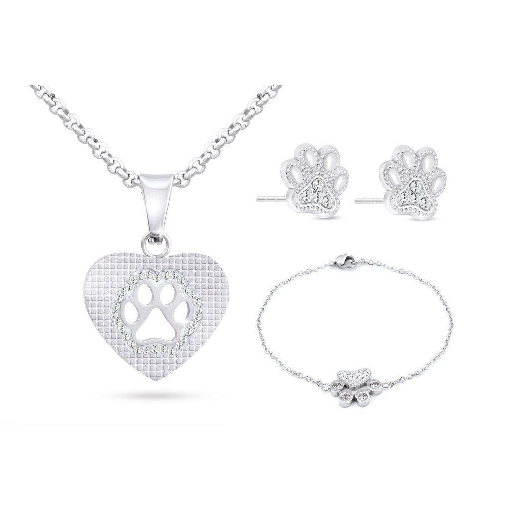 Súprava z chirurgickej ocele labka v srdci, retiazka + náušnice + náramok so zirkónmi 198