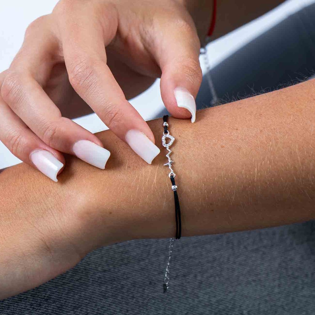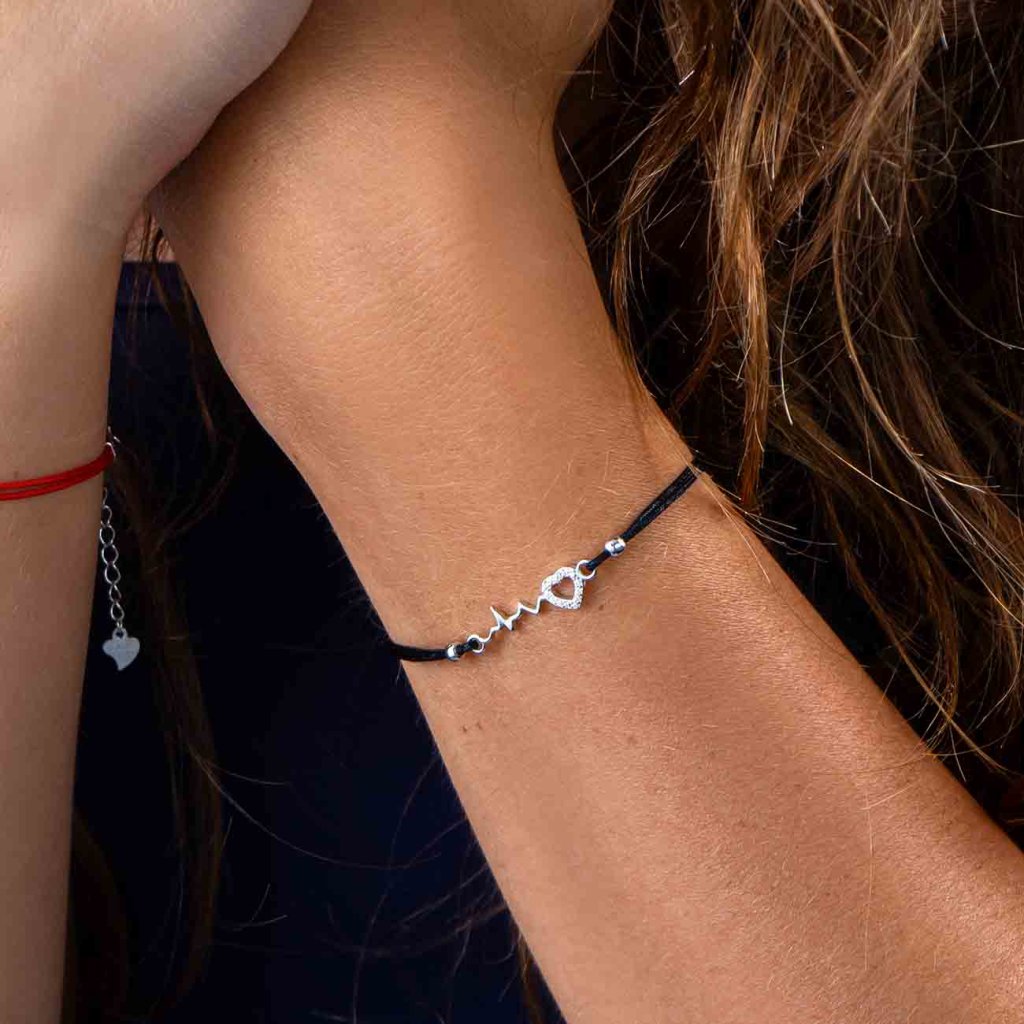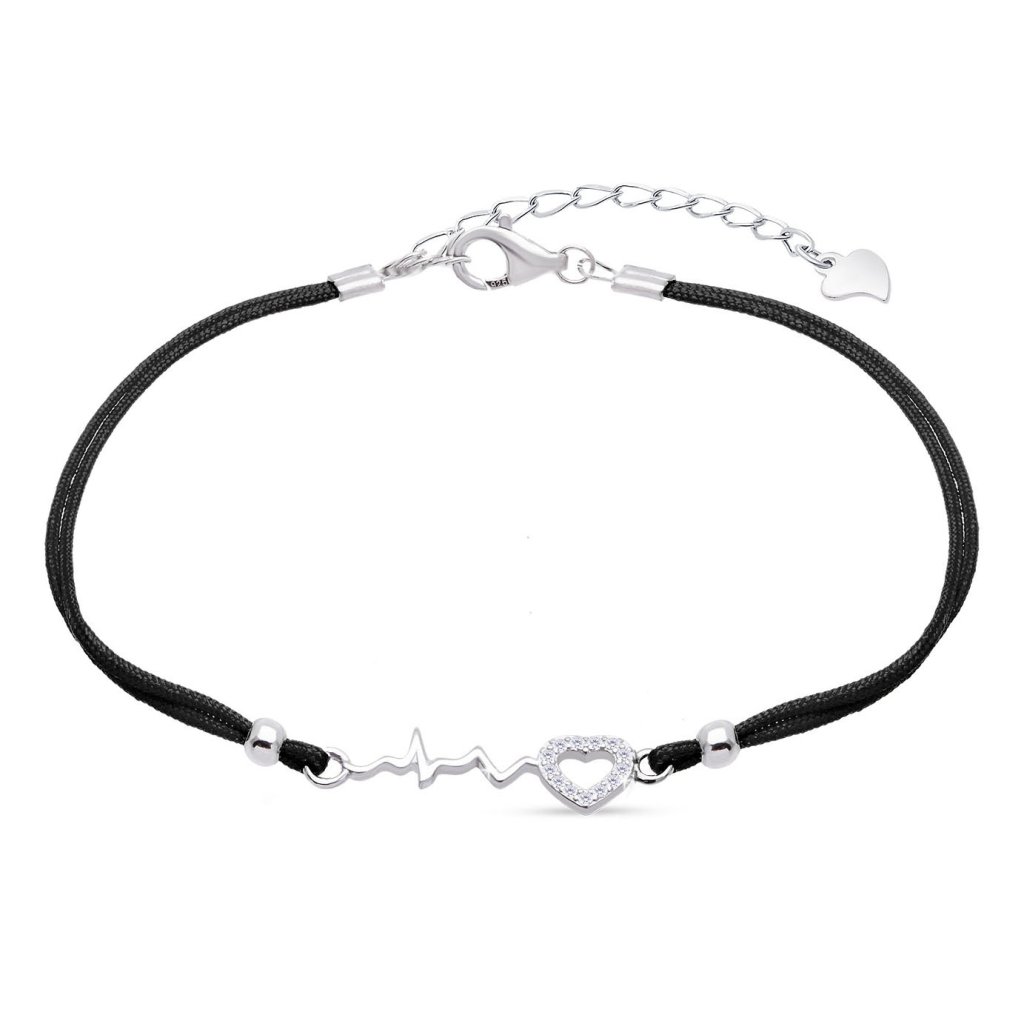 Dajte najavo svoje city s týmto originálnym náramkom s motívom srdcového tepu a srdiečka. Strieborný prvok je osadený drobnými trblietavými zirkónmi, ktoré dodávajú šperku jemný lesk a pôvab. Čierna textilná šnúrka je nielen štýlová, ale tiež tradične považovaná za symbol ochrany a šťastia. Náramok má nastaviteľné zapínanie s retiazkou zakončenou roztomilým srdiečkom – ideálny ako darček z lásky alebo amulet pre vašich blízkych.