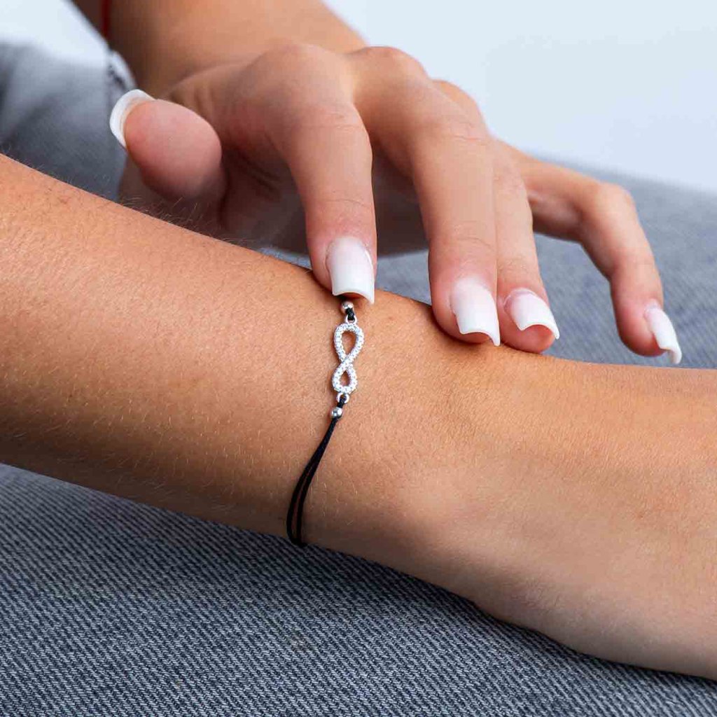 Symbolika a elegancia v jednom – tento jemný náramok je tvorený čiernou textilnou šnúrkou, ktorá sa tradične spája s ochranou a šťastím. Stredovú ozdobu tvorí lesklý symbol nekonečna zo striebra Ag 925/1000, osadený drobnými čírymi zirkónmi pre trblietavý efekt.