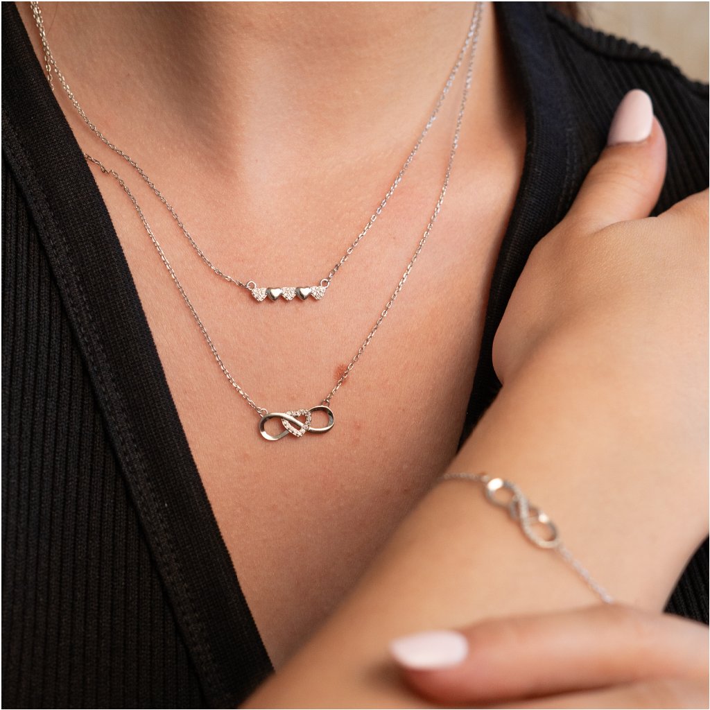 Tento romantický strieborný retiazka spája dva silné symboly – nekonečno a srdce. Symbol nekonečna značí večnosť, stabilitu a puto, zatiaľ čo srdce osadené jemnými zirkónmi dodáva náhrdelníku nádych nežnosti a emócií. Šperk je ideálnou voľbou pre každodenné nosenie aj ako darček pre výnimočnú osobu, ktorej chcete vyjadriť lásku, vďačnosť alebo priateľstvo.