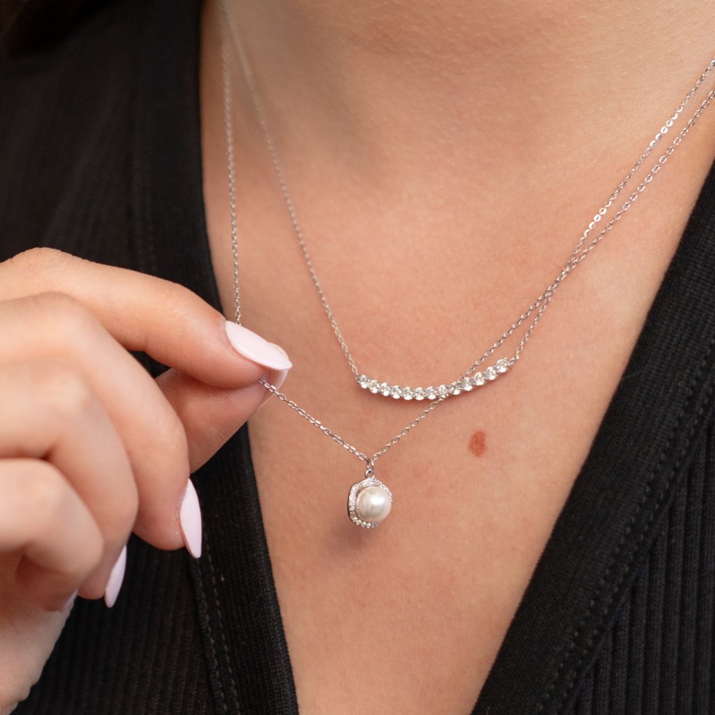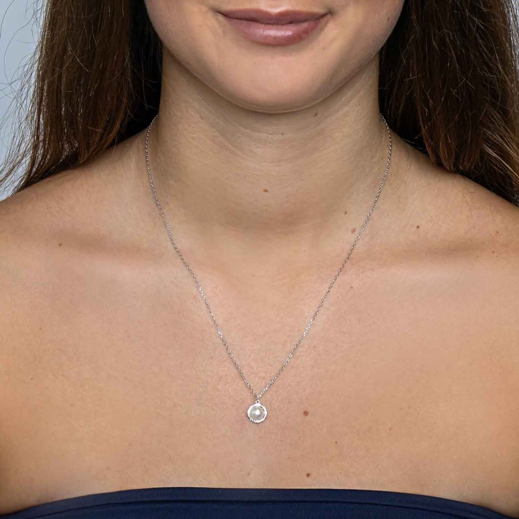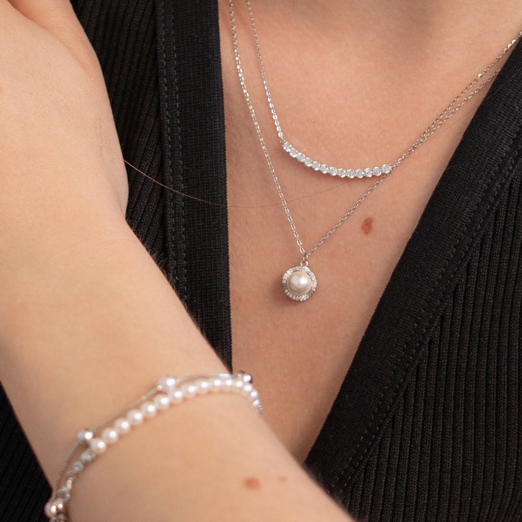 Elegantná retiazka s príveskom, ktorá spája klasickú krásu perly s trblietkami jemných čírych zirkónov. Dominantná syntetická perla je zasadená do kruhového lôžka a lemovaná žiarivými kamienkami, čo vytvára nadčasový a luxusný vzhľad. Ideálny doplnok na sviatočné príležitosti aj ako darček z lásky.
