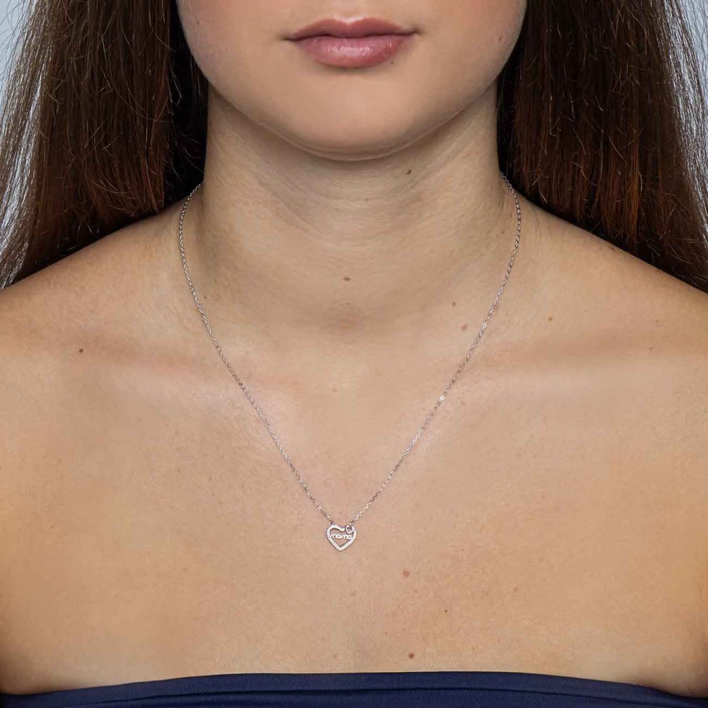 Strieborná retiazka s príveskom v tvare srdca, osadená čírymi zirkónmi a nápisom „mama“. Ideálne ako darček pre mamičku.