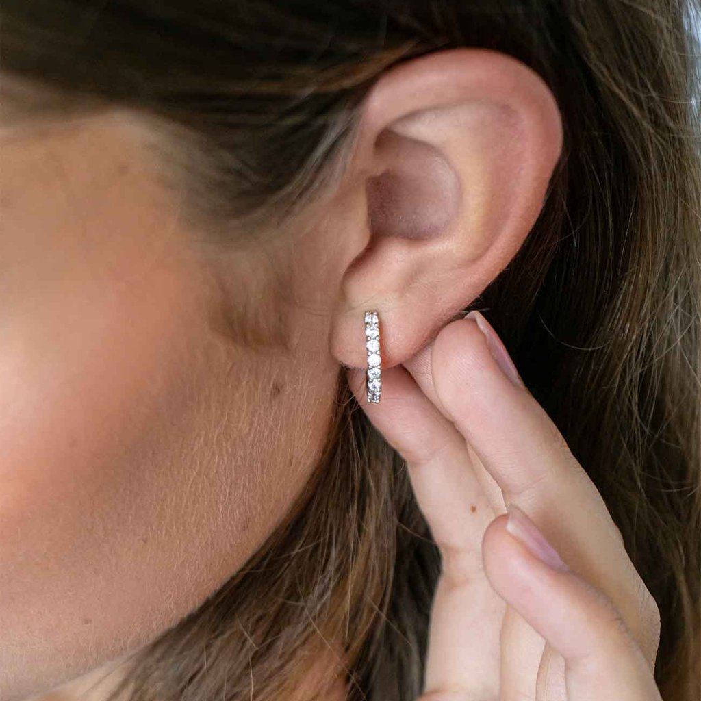 Klasika s noblesným leskom – tieto kruhové náušnice sú osadené radom čírych zirkónov, ktoré krásne odrážajú svetlo a dodávajú šperku iskrivý efekt. Vďaka svojmu decentnému a nadčasovému prevedeniu sa hodia k akémukoľvek outfitu – od každodenného po slávnostný.