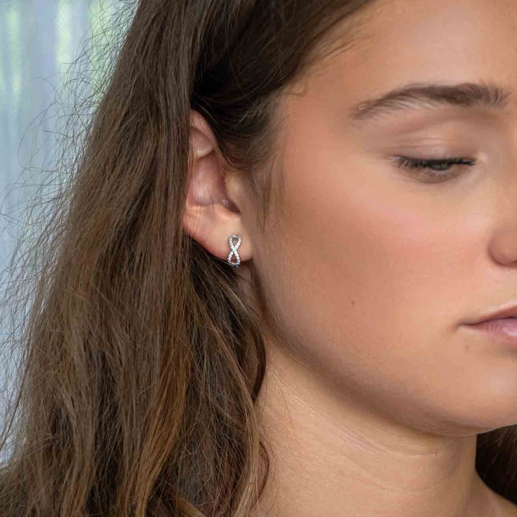 Symbol elegancie a večnosti. Tieto strieborné náušnice z pravého striebra Ag 925/1000 v tvare ležatej osmičky – symbolu nekonečna – sú osadené jemnými čírymi zirkónmi, ktoré im dodávajú jemný trblietanie a ženský pôvab. Zapínanie na klapku zaisťuje pohodlné a bezpečné nosenie. Perfektné ako darček s hlbším významom.