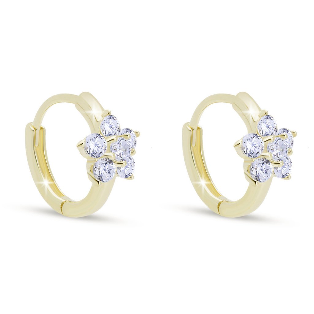 Elegantné kruhové náušnice s jemným kvetinovým zdobením tvoreným čírymi zirkónmi vyniknú pri každej príležitosti. Decentný dizajn v kombinácii s pozláteným striebrom vytvára harmonický šperk, ktorý sa hodí ako na každodenný outfit, tak aj na slávnostné udalosti. Pohodlné zapínanie a precízne spracovanie zaisťujú jednoduché nosenie.