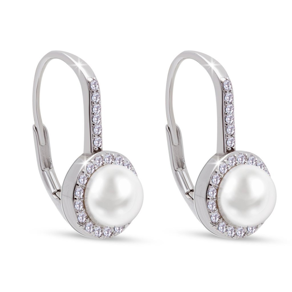 Elegantné náušnice zdobené centrálnou perlou a lemované drobnými čírymi zirkónmi. Klasický a nadčasový dizajn, ktorý podčiarkne ženskosť a štýl – ideálny na slávnostné aj každodenné nosenie.