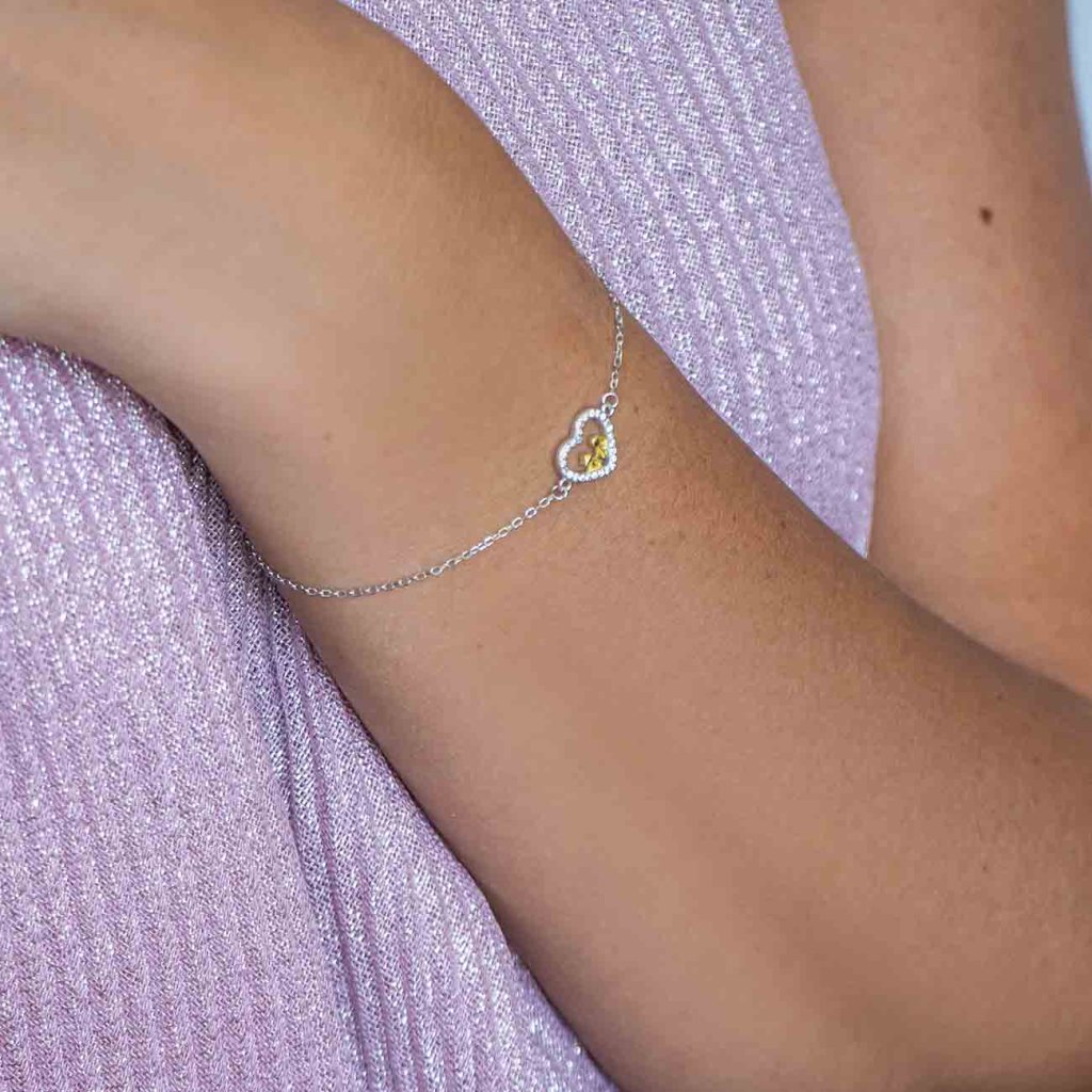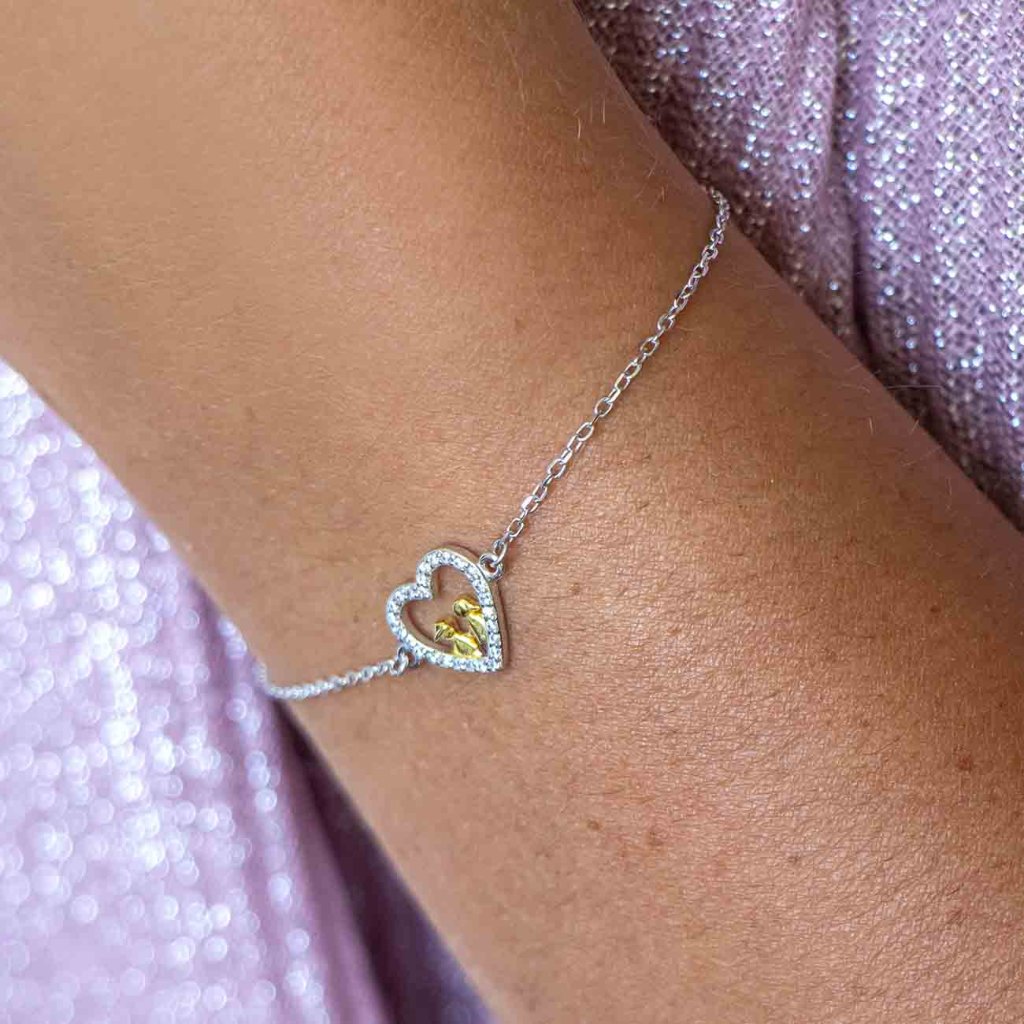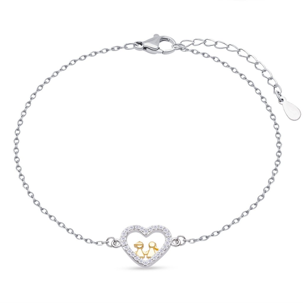 Tento elegantný strieborný náramok v sebe spája jemnosť a hlbší význam. Srdce, vykladané čírymi zirkónmi, ukrýva zlatom zvýraznené postavičky – štylizovaný pár, ktorý predstavuje lásku, priateľstvo alebo rodinné puto.