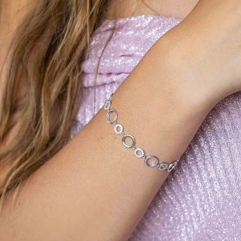 Tento elegantný náramok z kvalitného striebra Ag 925/1000 vyniká originálnym dizajnom zloženým z pravidelne sa striedajúcich otvorených kruhov – niektoré s hladkým lesklým povrchom, iné zdobené jemnými čírymi zirkónmi. Výsledný efekt je harmonický, vkusný a svieži.