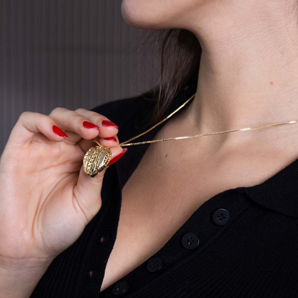 Štýlová retiazka s dominantným príveskom v tvare srdca zaujme originálnym priestorovým spracovaním a kombináciou lesklých aj štruktúrovaných plôch. Plastický dizajn dodáva šperku hĺbku a výraz, zatiaľ čo pozlátenie 14K zlatom podčiarkuje jeho elegantný a nadčasový charakter. Retiazka sa krásne vyníma samostatne a stáva sa výrazným doplnkom každodenného aj elegantného outfitu.