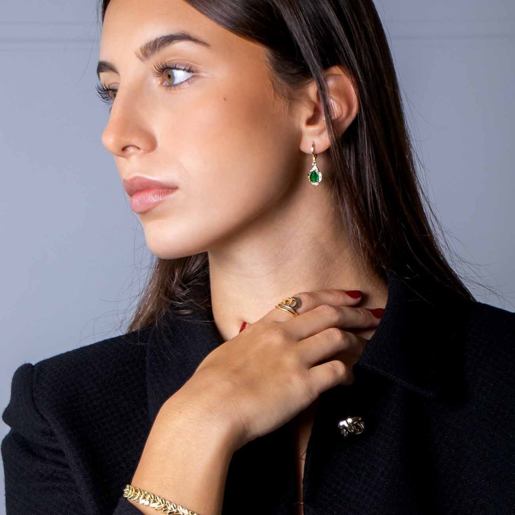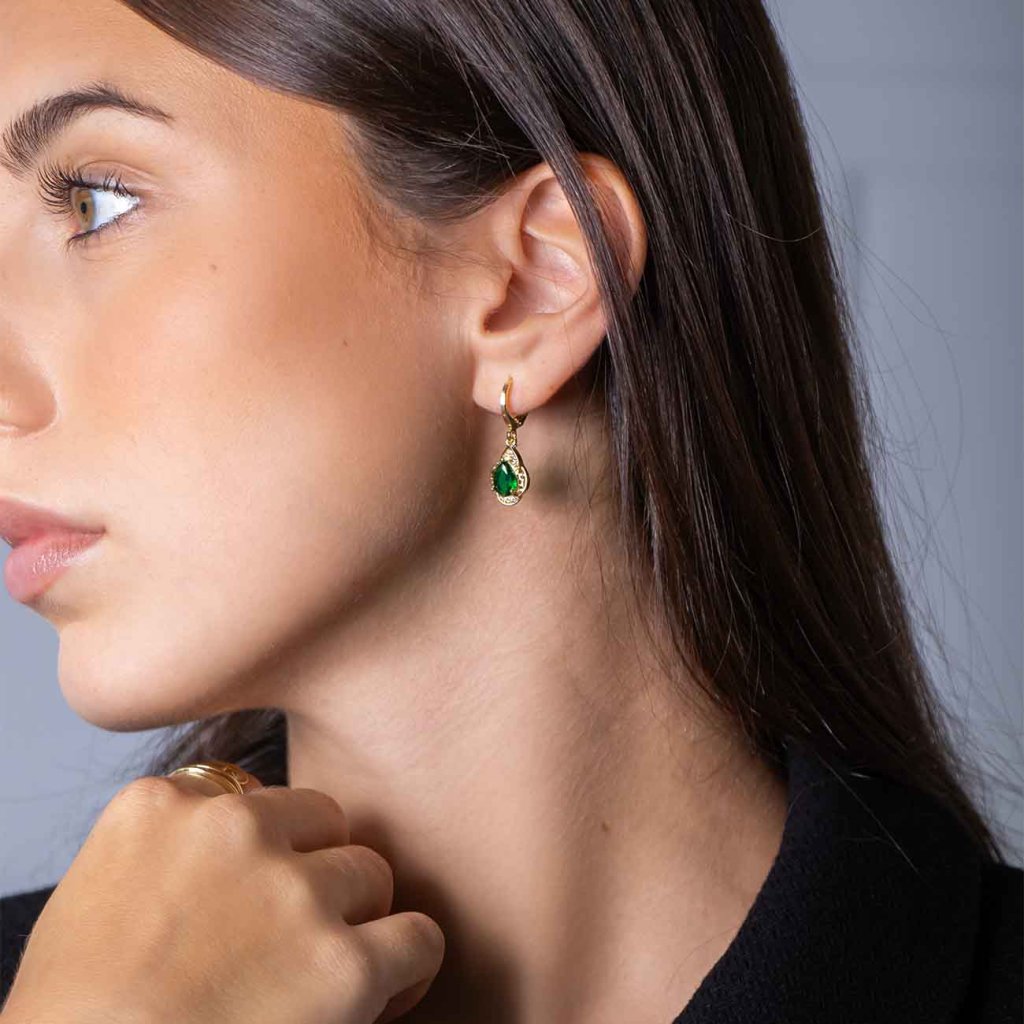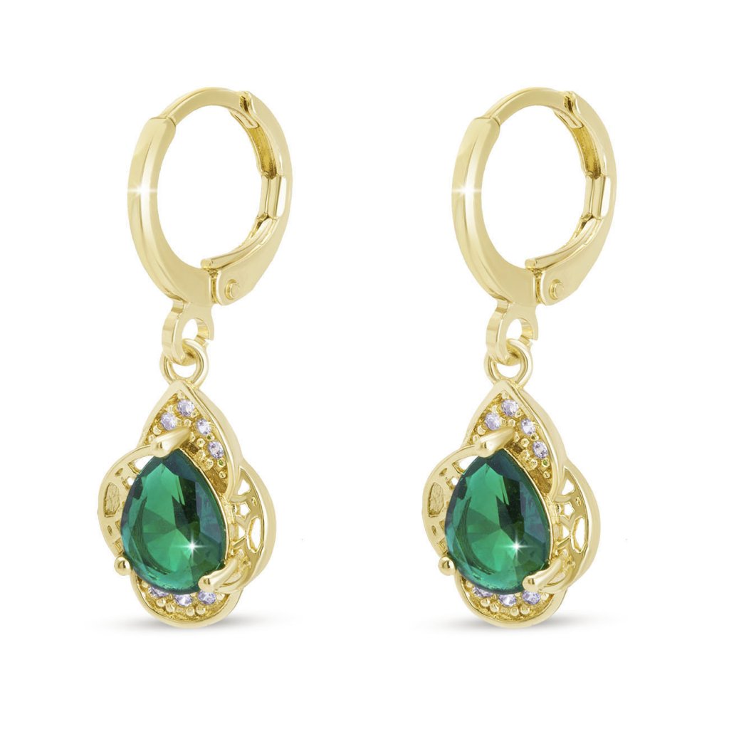 Trblietanie a elegancia v jedinečnej harmónii. Tieto pozlátené visiace náušnice s kvapkovitým zeleným kameňom pripomínajú kvapku rosy ukrytú v zlatej čipke. Detailné spracovanie a jemné osadenie zirkónmi vytvára luxusný dojem, ktorý zvýrazní ako denný, tak večerný outfit. Ideálne pre slávnostné príležitosti aj ako vkusný darček.