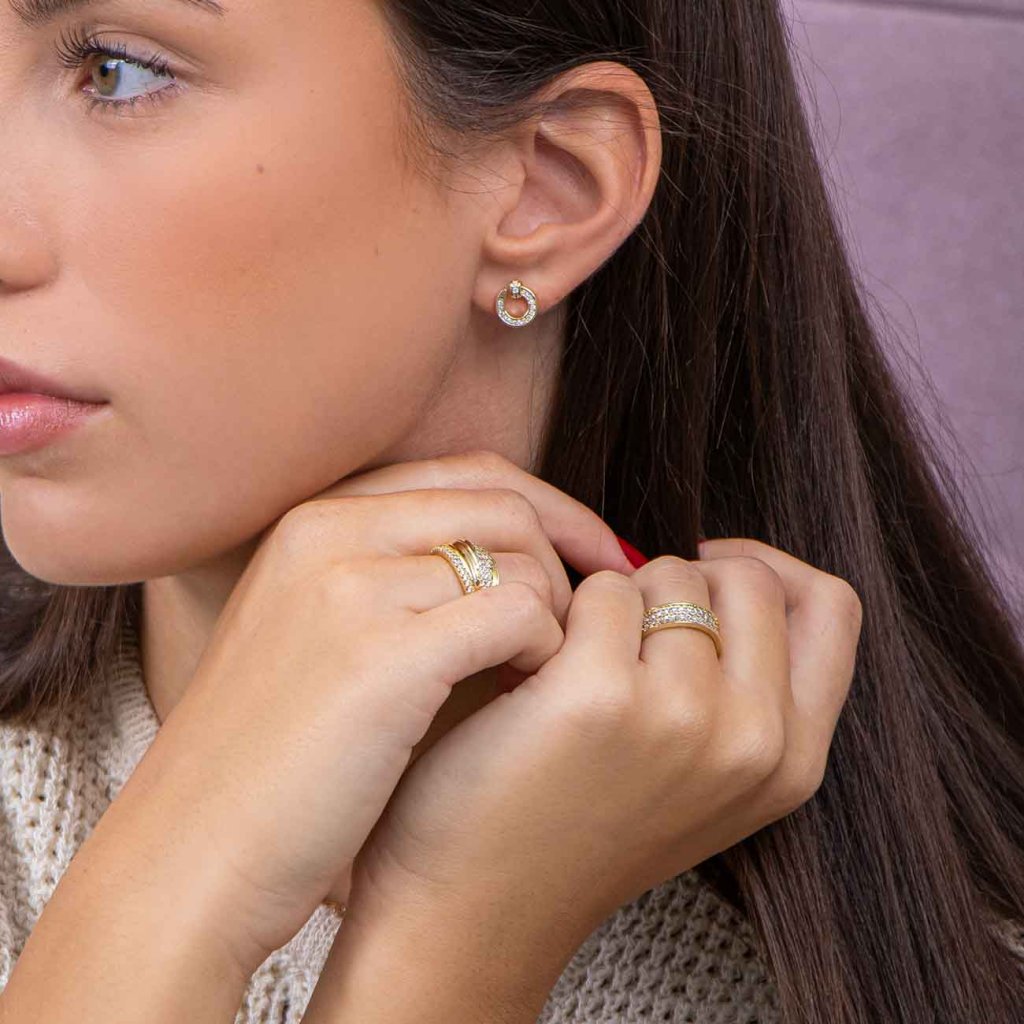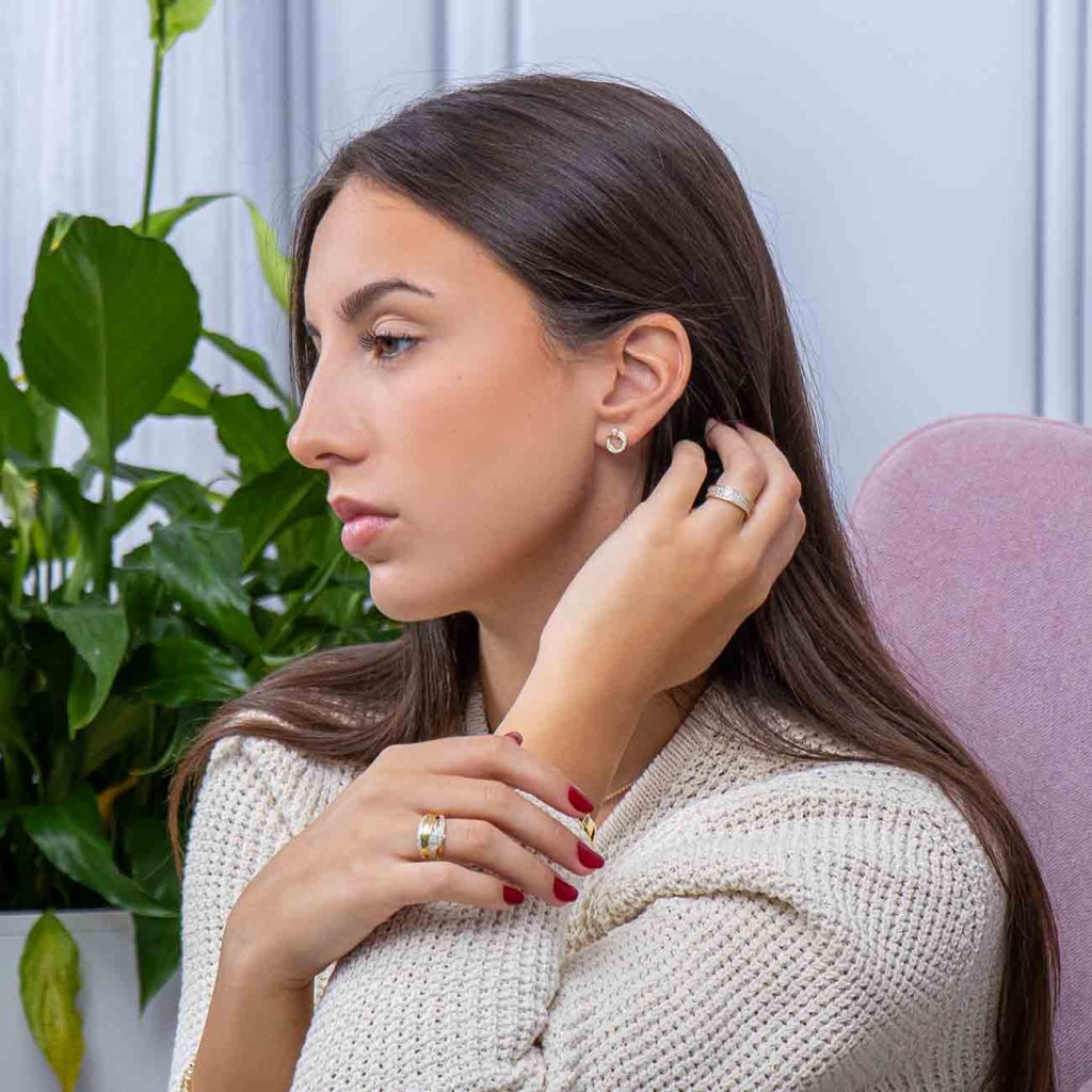 Elegantné kruhové náušnice s jemne trblietavými zirkónmi, ktoré sú vsadené do lesklého pozláteného rámu. Minimalistický dizajn v tvare otvoreného kruhu pôsobí moderne, a predsa jemne – ideálna voľba pre ženy, ktoré milujú vkusné a nadčasové doplnky. Ľahko sa kombinujú s ostatnými šperkami a hodia sa tak do práce, ako aj na večierok.